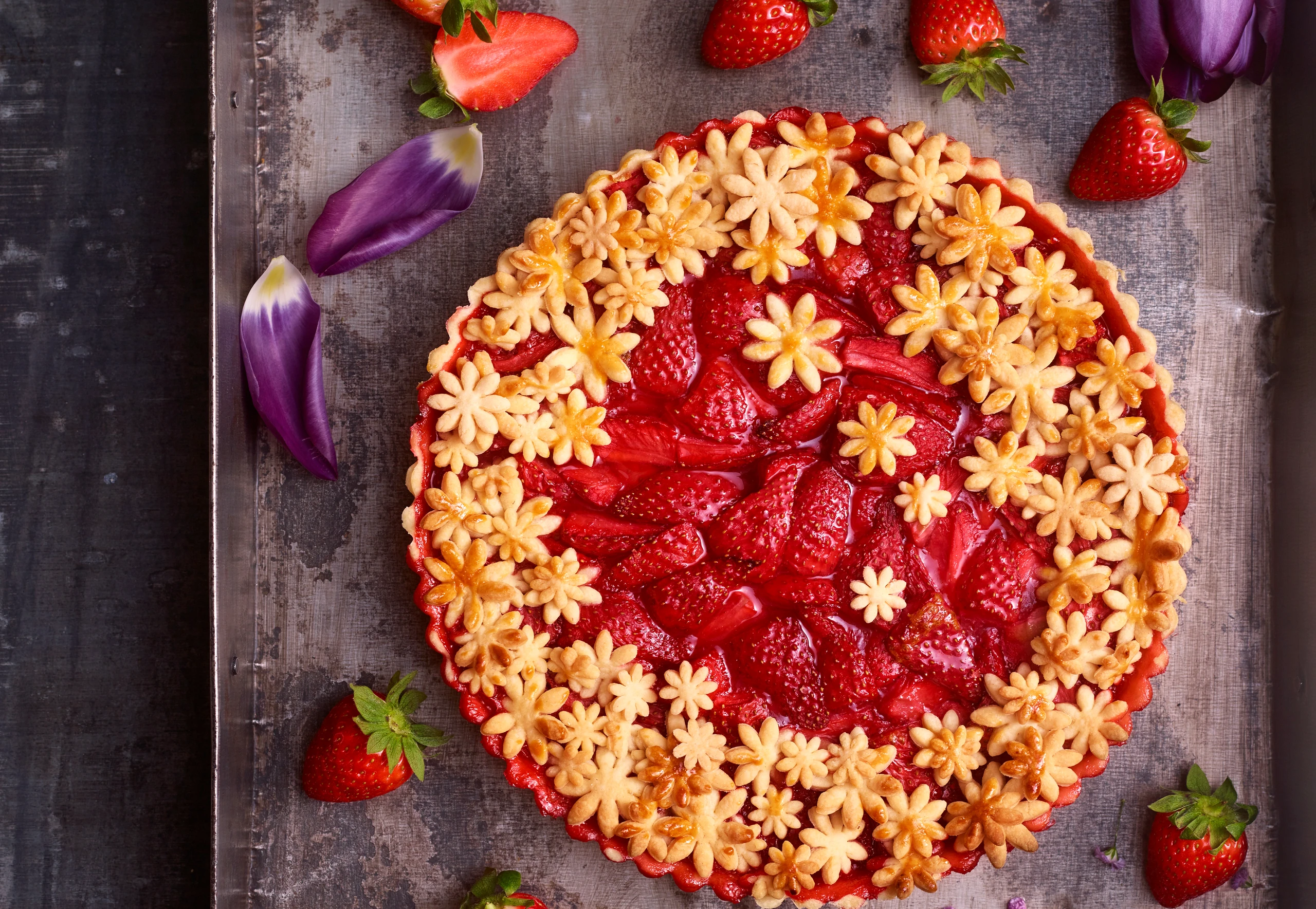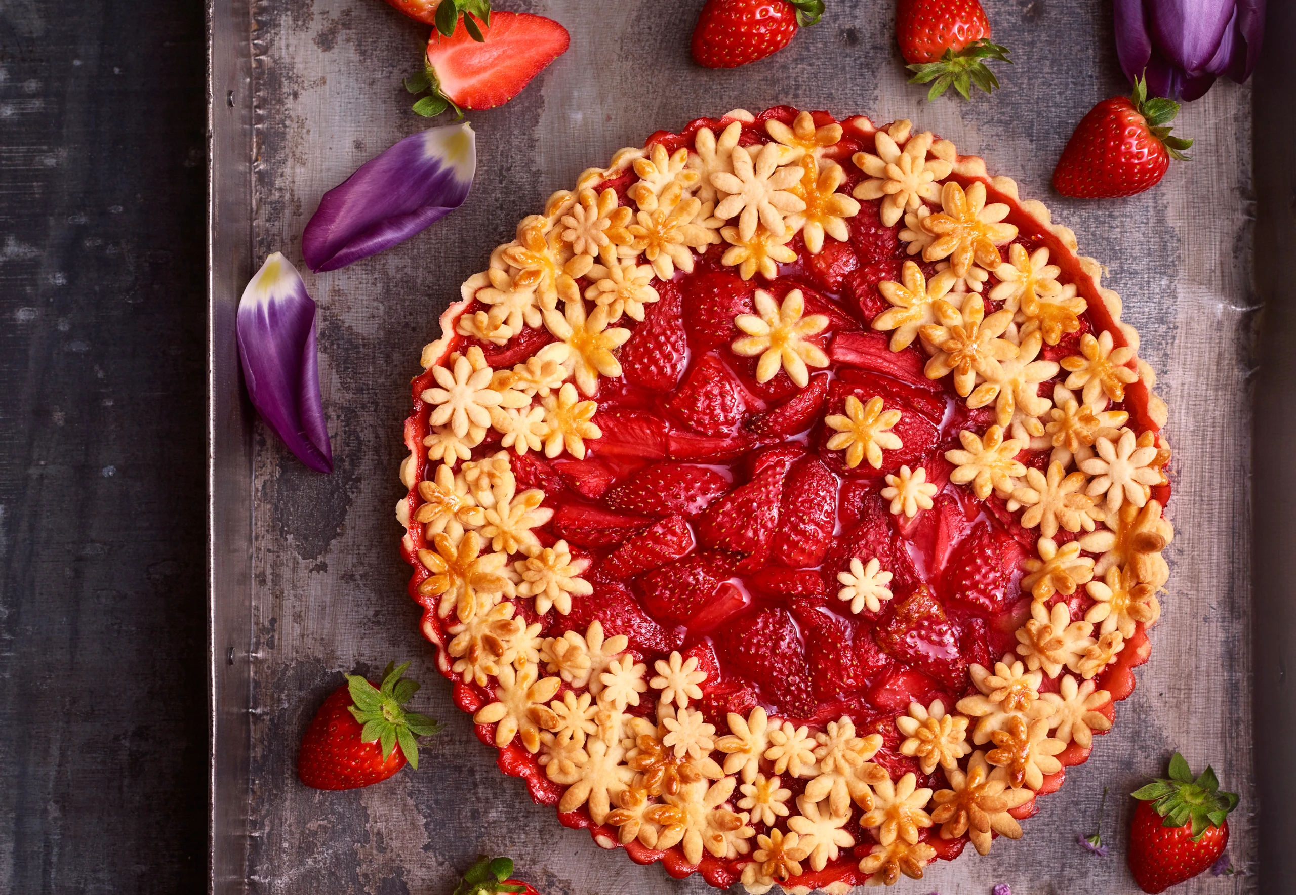 Übrigen Teig dünn ausrollen und daraus Blüten ausstechen. Pie mit den Blüten belegen.