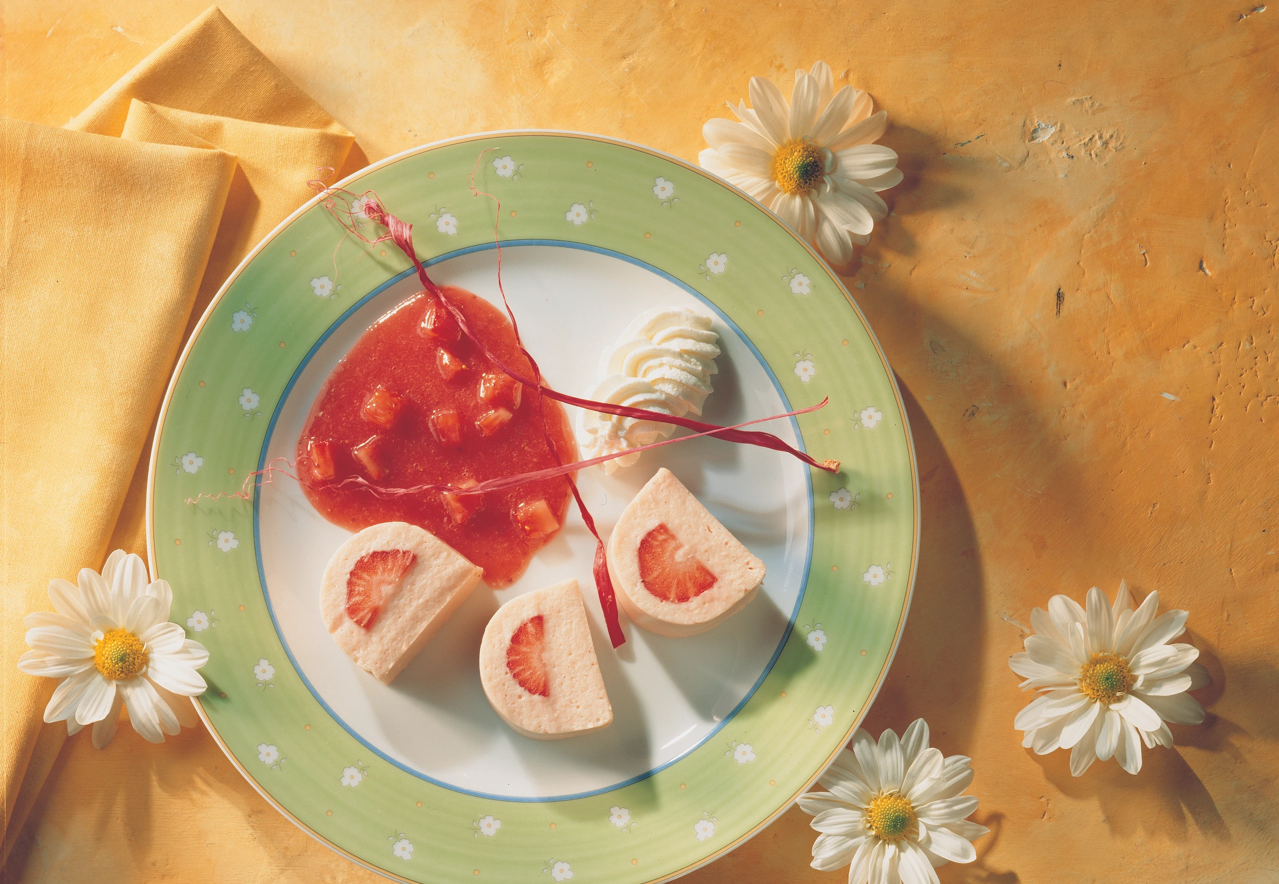 Gelatine in kaltem Wasser einweichen, gut ausdrücken und im warmen Rhabarberpüree auflösen. Püree beiseitestellen.