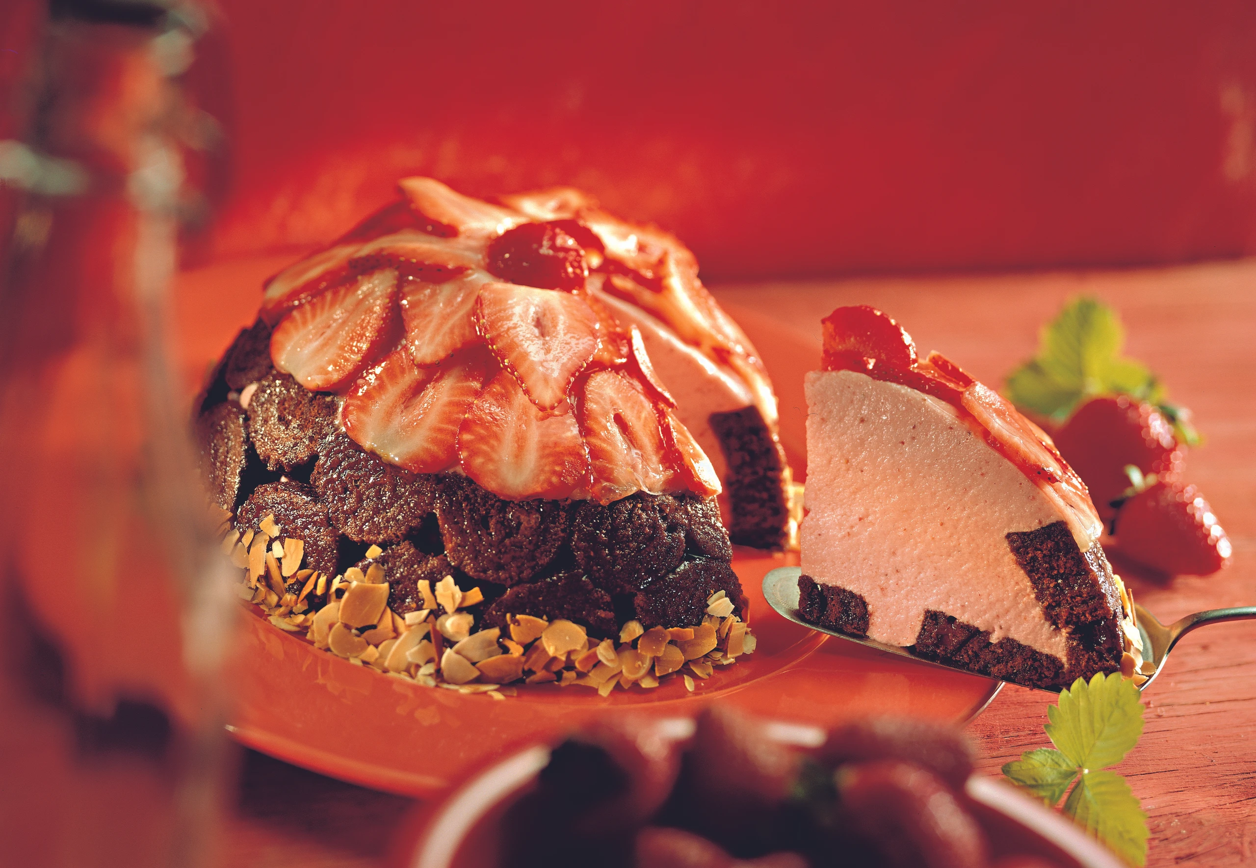 Kuppel aus der Schüssel stürzen und die Folie entfernen. Tortengelee nach Anleitung zubereiten. Erdbeeren in Scheiben schneiden. Den Crementeil der Kuppel mit den Erdbeerscheiben belegen, die Früchte dünn mit Tortengelee bestreichen. Unteren Rand der Kuppel mit Mandelblättchen bestreuen. Kuppel vor dem Anschneiden ca. 1/2 Stunde kühlen, damit das Gelee fest wird.