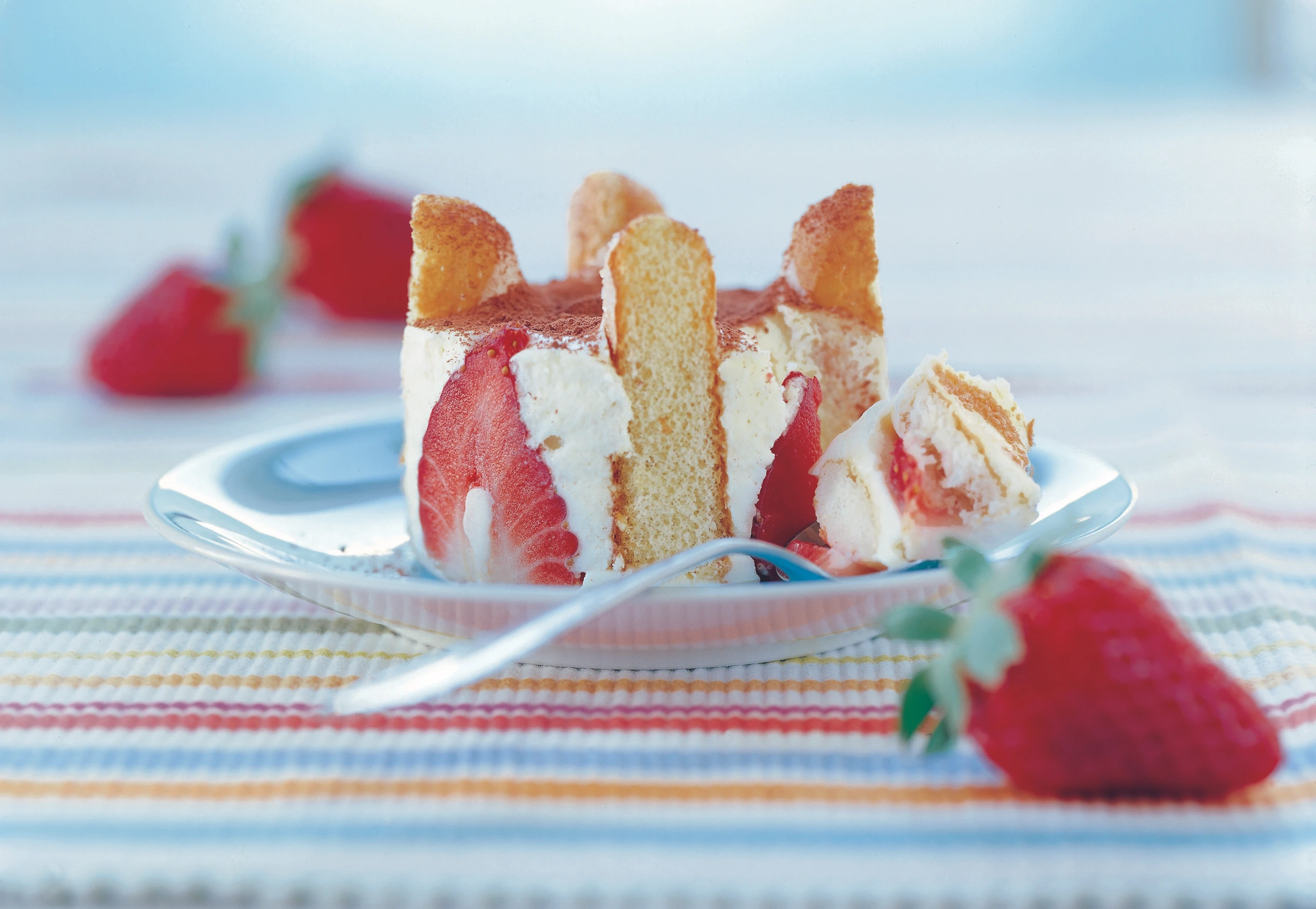 Mascarpone unter die Eimasse rühren. Das Obers unterheben. Förmchenränder mit Erdbeeren und Biskotten auskleiden, Creme einfüllen. Cremen mit Frischhaltefolie zudecken und mindestens 3 Stunden kühlen.