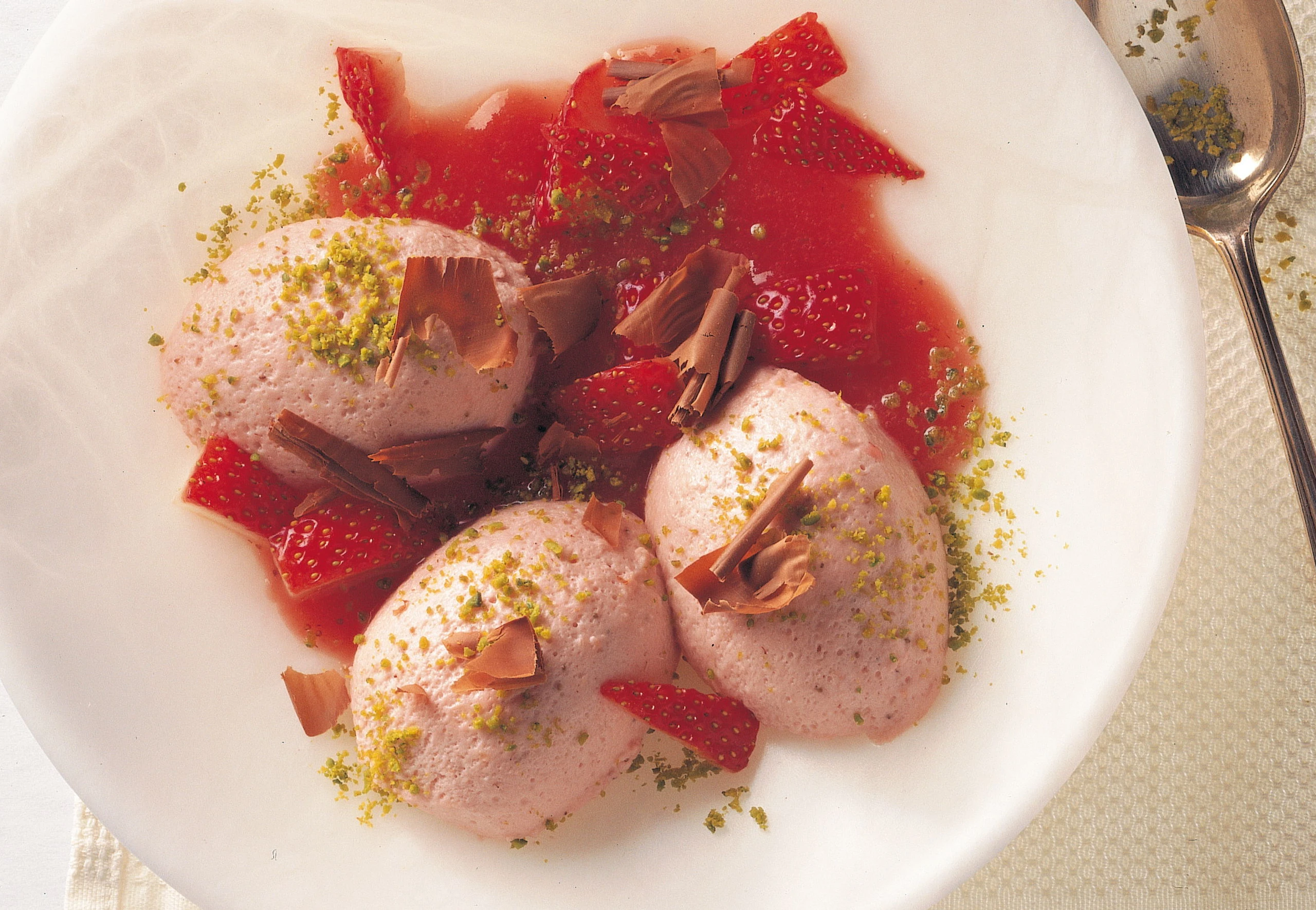 Aus der Creme mit einem Löffel Nocken ausstechen, auf Tellern anrichten und am besten mit Erdbeersauce, frischen Erdbeeren, Schokoladespänen und gehackten Pistazien garnieren.