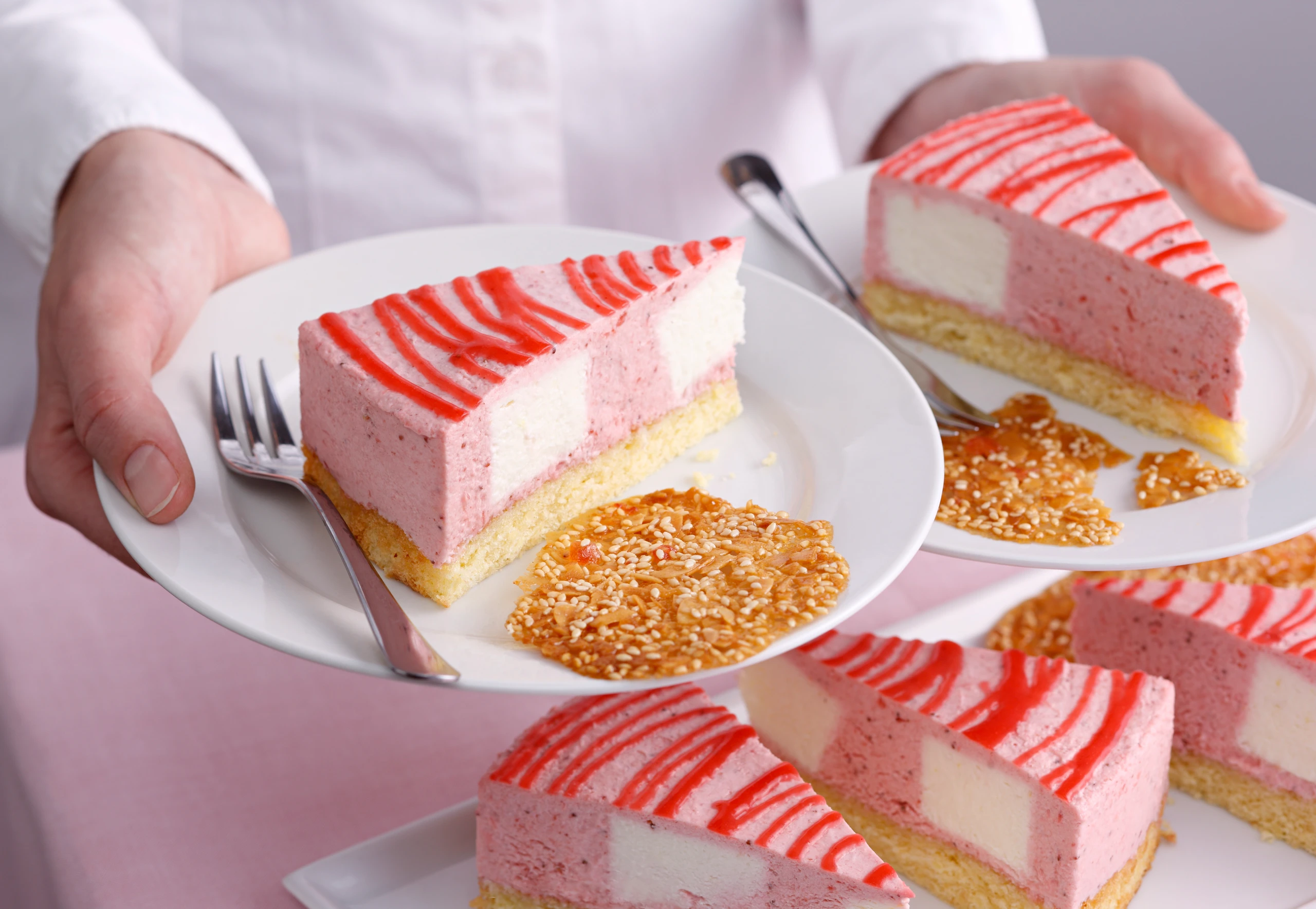 Garnitur: Erdbeeren mit Staubzucker fein pürieren. Gelatine in kaltem Wasser einweichen, mit 1 EL Erdbeerpüree erwärmen, mit dem restlichen Püree verrühren. In ein Papierstanitzel füllen und Kreise auf die Torte dressieren. Torte ca. 1 Stunde kühlen. Torte aus der Form lösen, in Stücke schneiden und mit den Sesam-Kirsch-Blättern servieren.