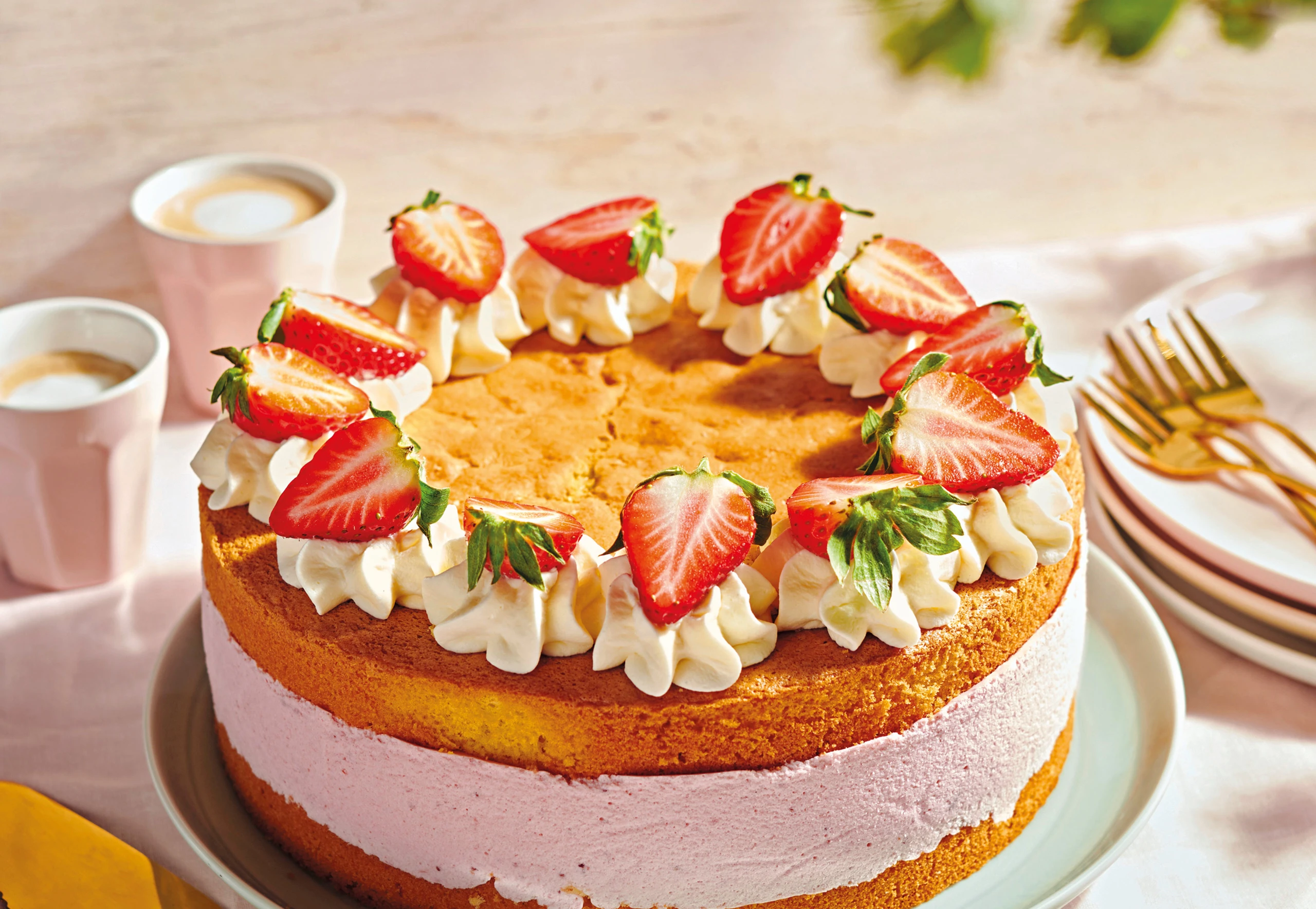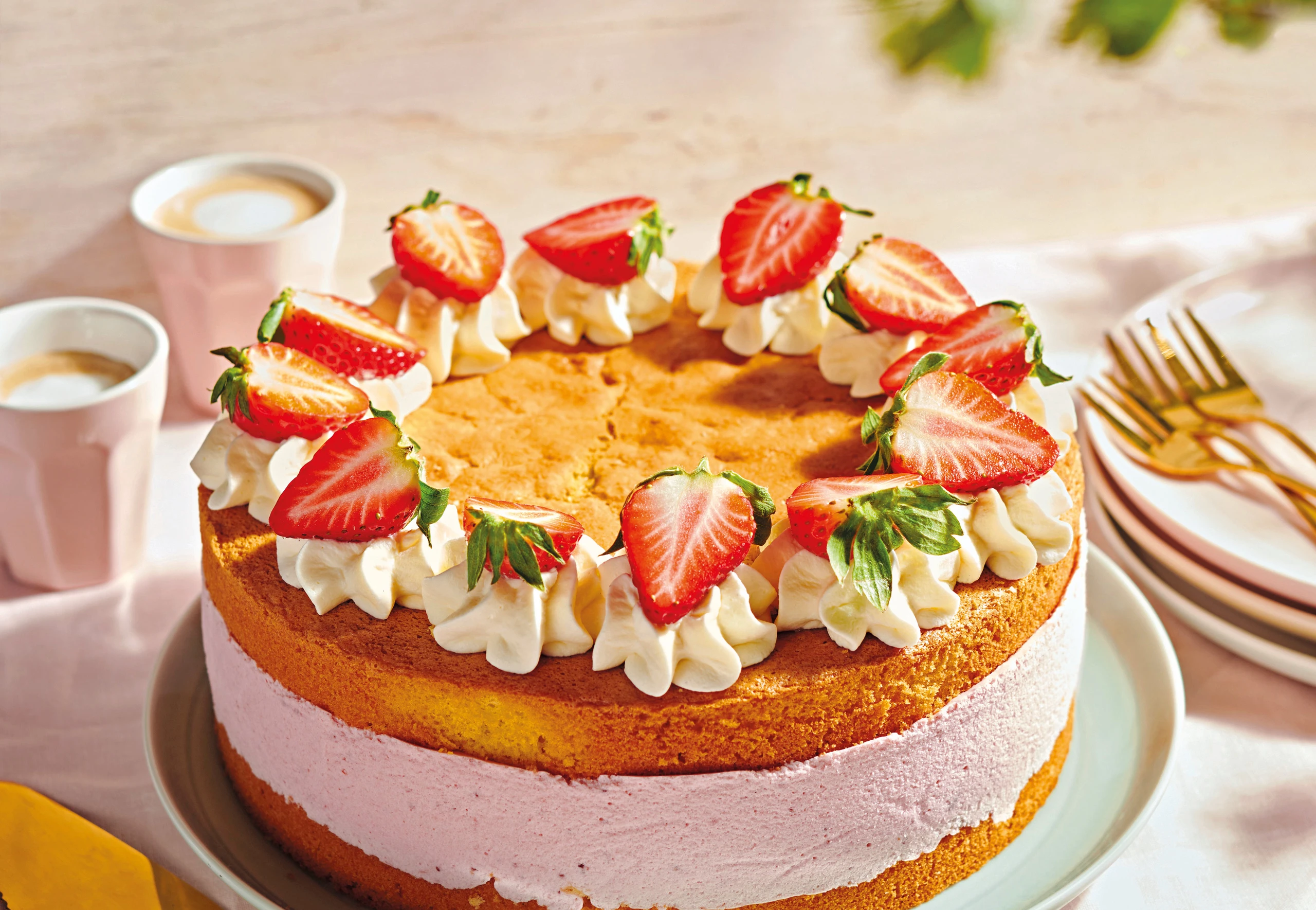 Torte aus dem Ring lösen, Backpapierstreifen abziehen. Obers mit Staubzucker cremig mixen und in einen Dressiersack mit großer Sterntülle füllen. Erdbeeren halbieren. Torte mit Obers und Erdbeeren dekorieren.