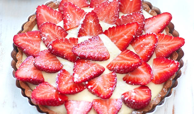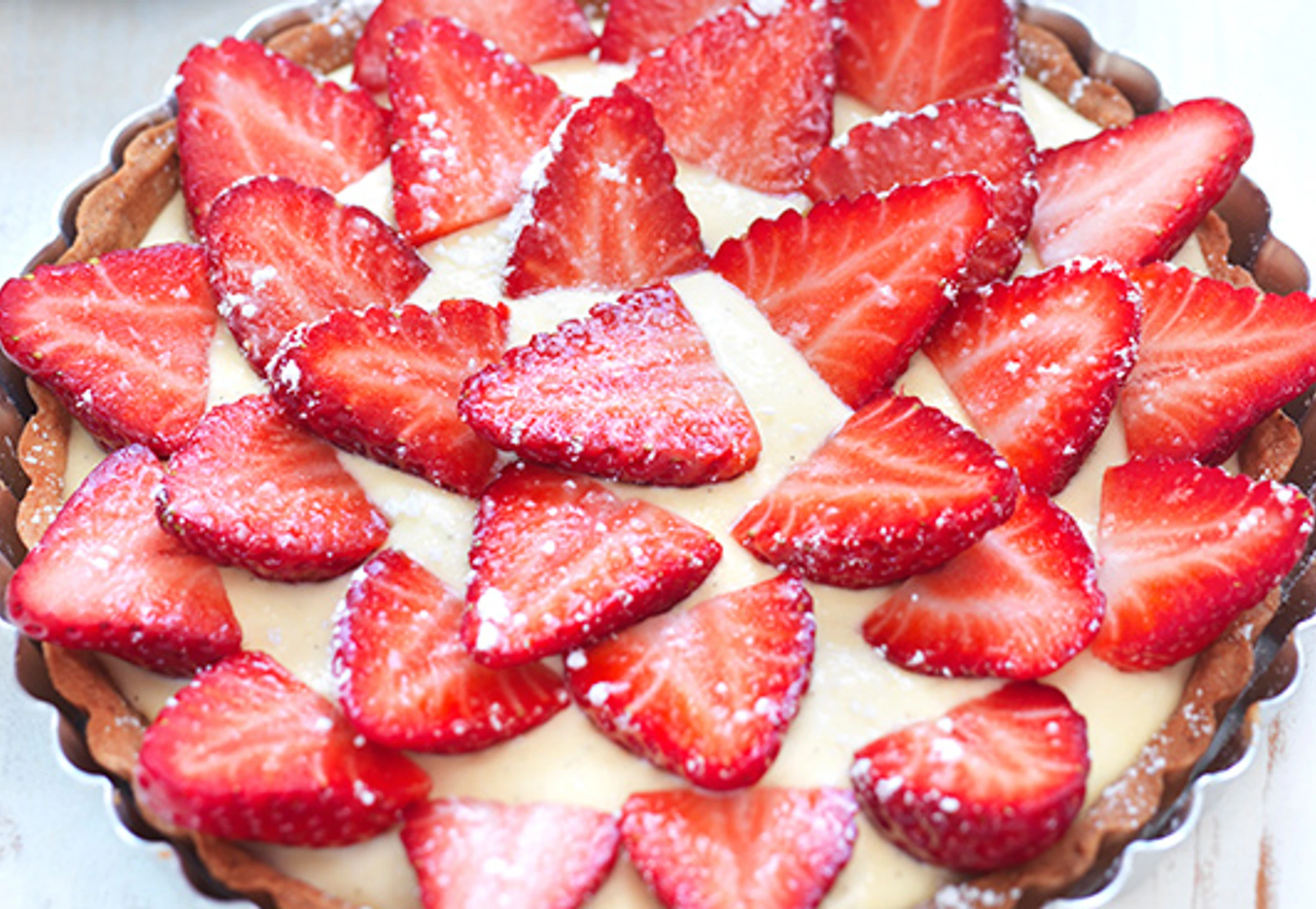 Erdbeeren halbieren, Tartes damit belegen und mit Staubzucker bestreuen.