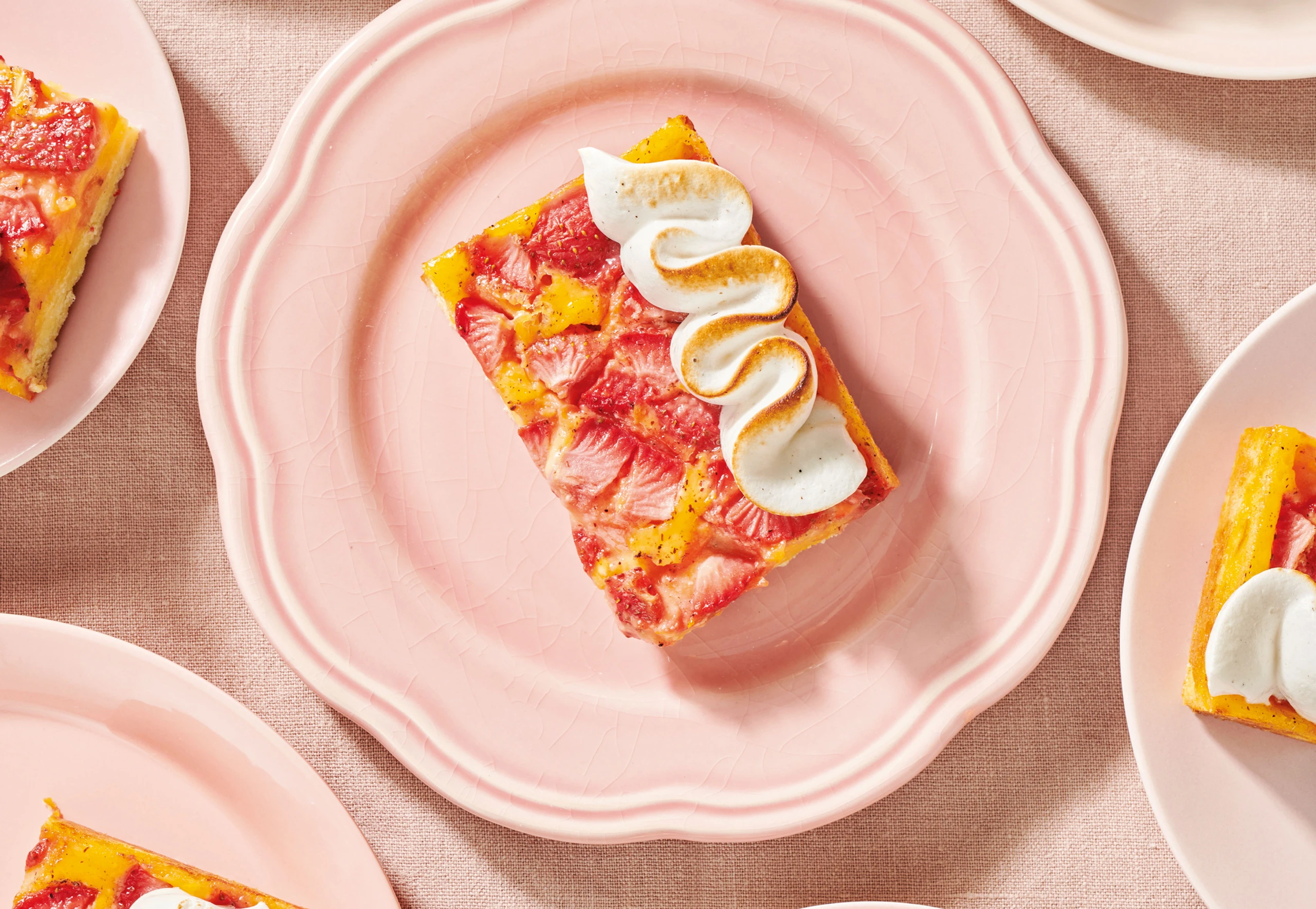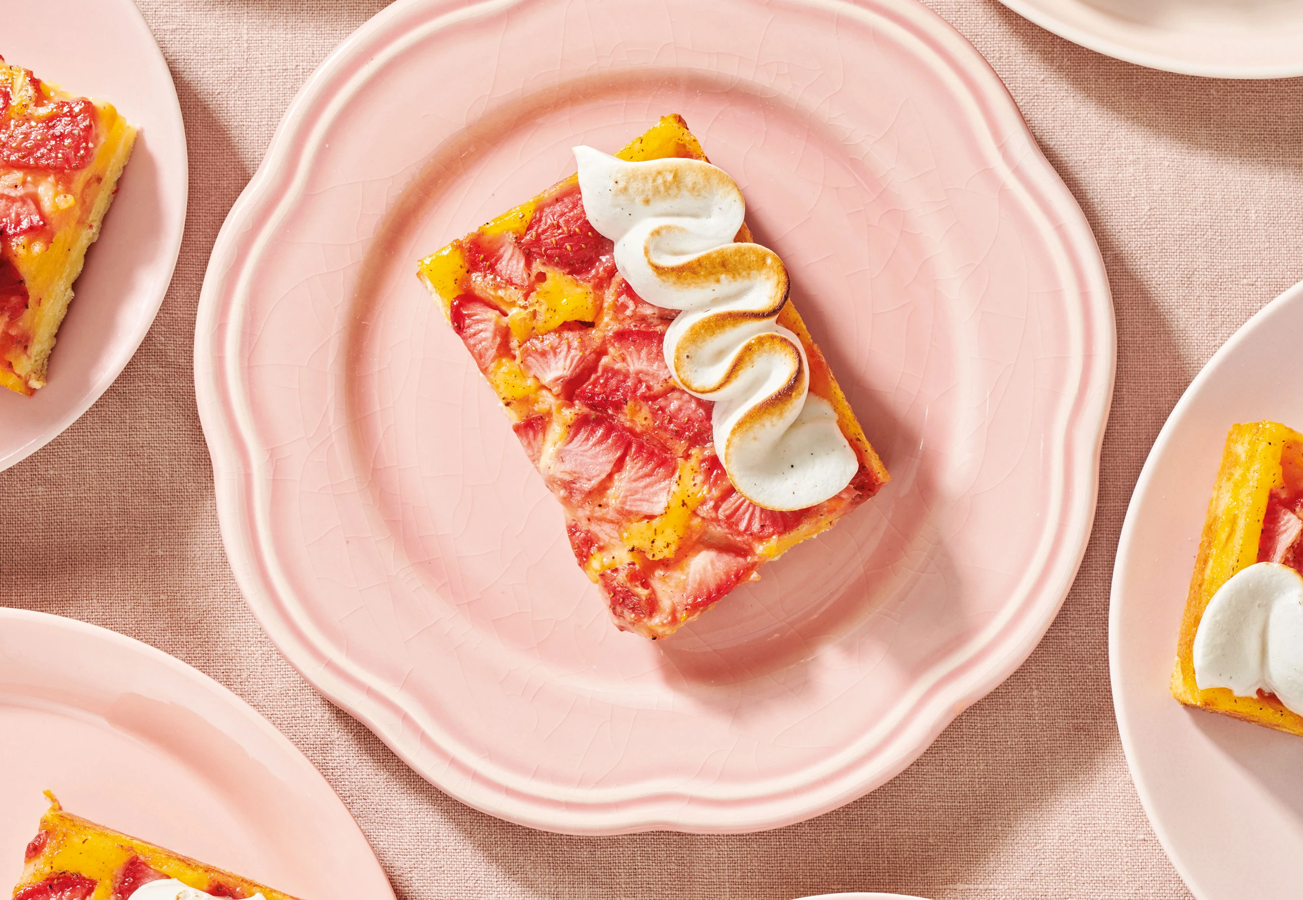Für das Baiser Eiklar, Vanille und Zucker zu steifem Schnee schlagen. Baiser in einen Dressiersack mit Tülle füllen und die Schnitte damit verzieren. Mit einem Bunsenbrenner abflämmen oder im Rohr (Oberhitze ca. 200 °C) kurz überbacken.