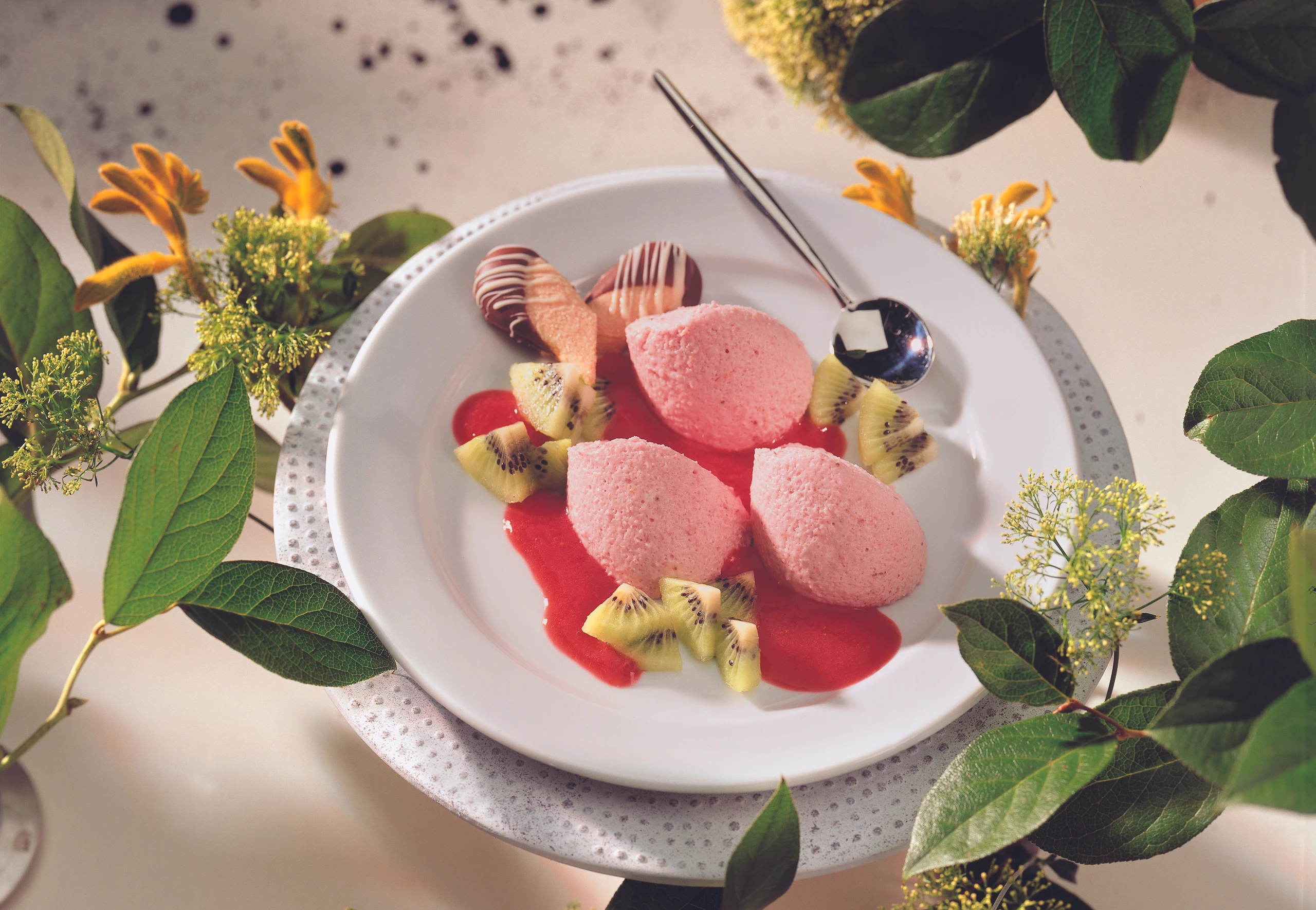 Mit einem Löffel gleich große Nockerln aus der Creme ausstechen, mit den Kiwischeiben und der Sauce anrichten und mit den Biskotten garnieren.