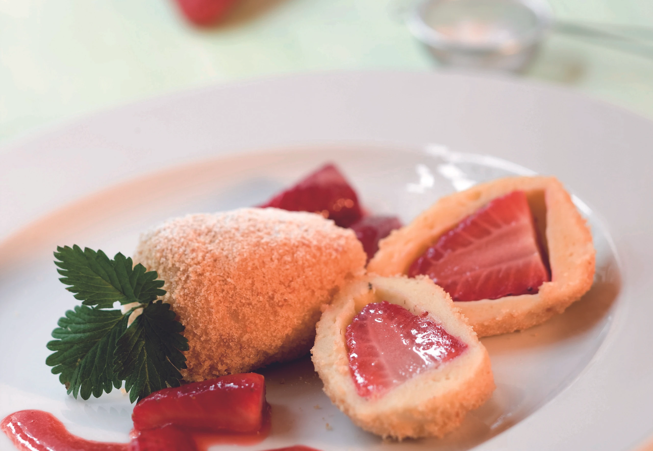 Teig zu einer Rolle formen und in 8 Scheiben schneiden. Scheiben flach drücken, je 1 Erdbeere mit Teig umhüllen und zu Knödeln formen. Salzwasser aufkochen, Knödel da-rin 10 Minuten köcheln.