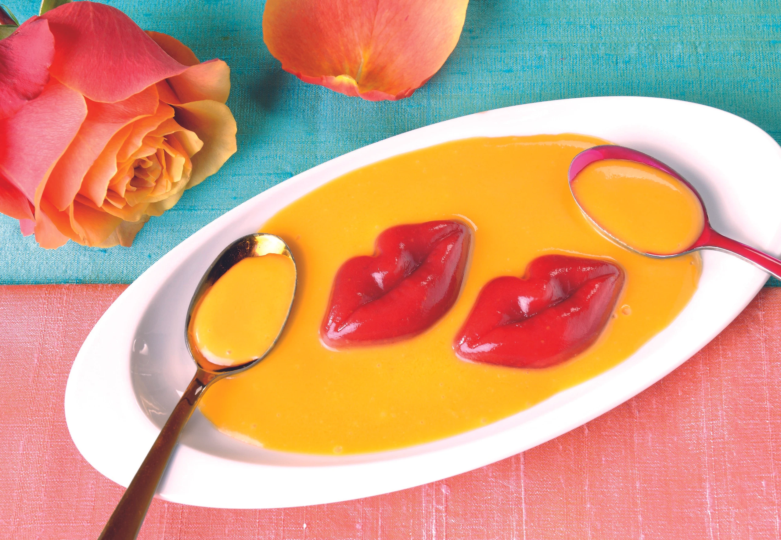 - Erdbeermünder auf Teller stürzen und mit der Mango-Kokos-Creme umgießen.