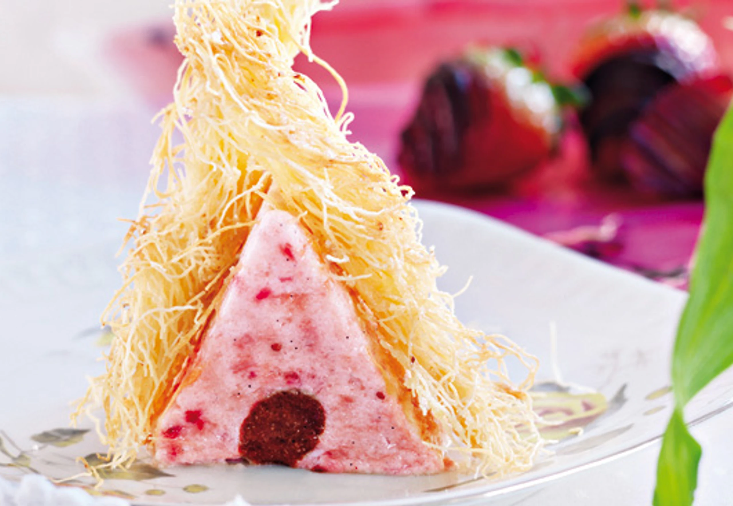 - Parfait stürzen, Folie entfernen, Parfait portionieren und mit dem Kadayifteig garniert servieren.