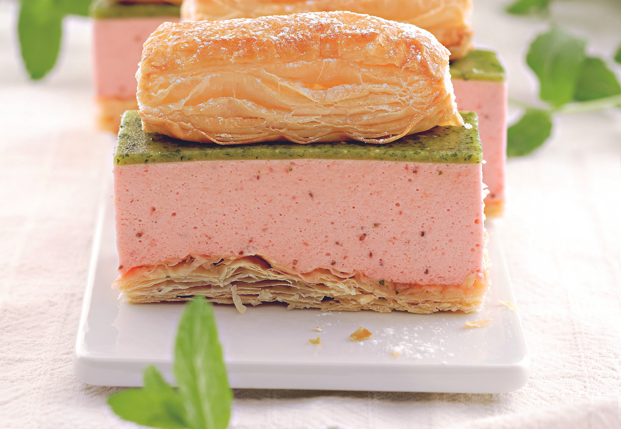 Für das Gelee Minzeblättchen abzupfen. Gelatine in kaltem Wasser einweichen. Pinienkerne mit Minze, Sekt und Zucker pürieren. Gelatine ausdrücken, mit. 1 TL Wasser erhitzen und auflösen. Rasch mit dem Minzepüree vermischen. Püree auf der Creme verteilen. Schnitte für ca. 1 Stunde kühl stellen.