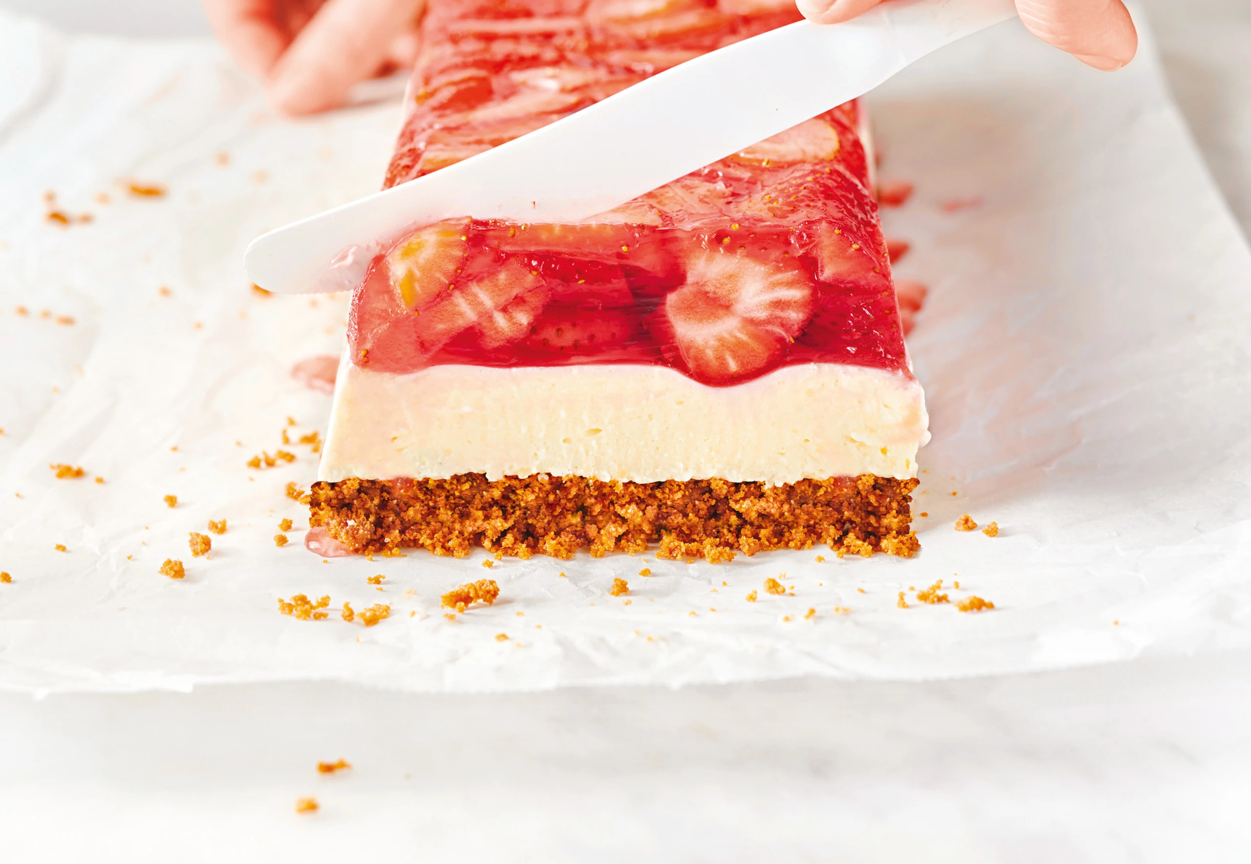 Schnitte stürzen, Backpapier abziehen. Bis zum Servieren kühlen.
