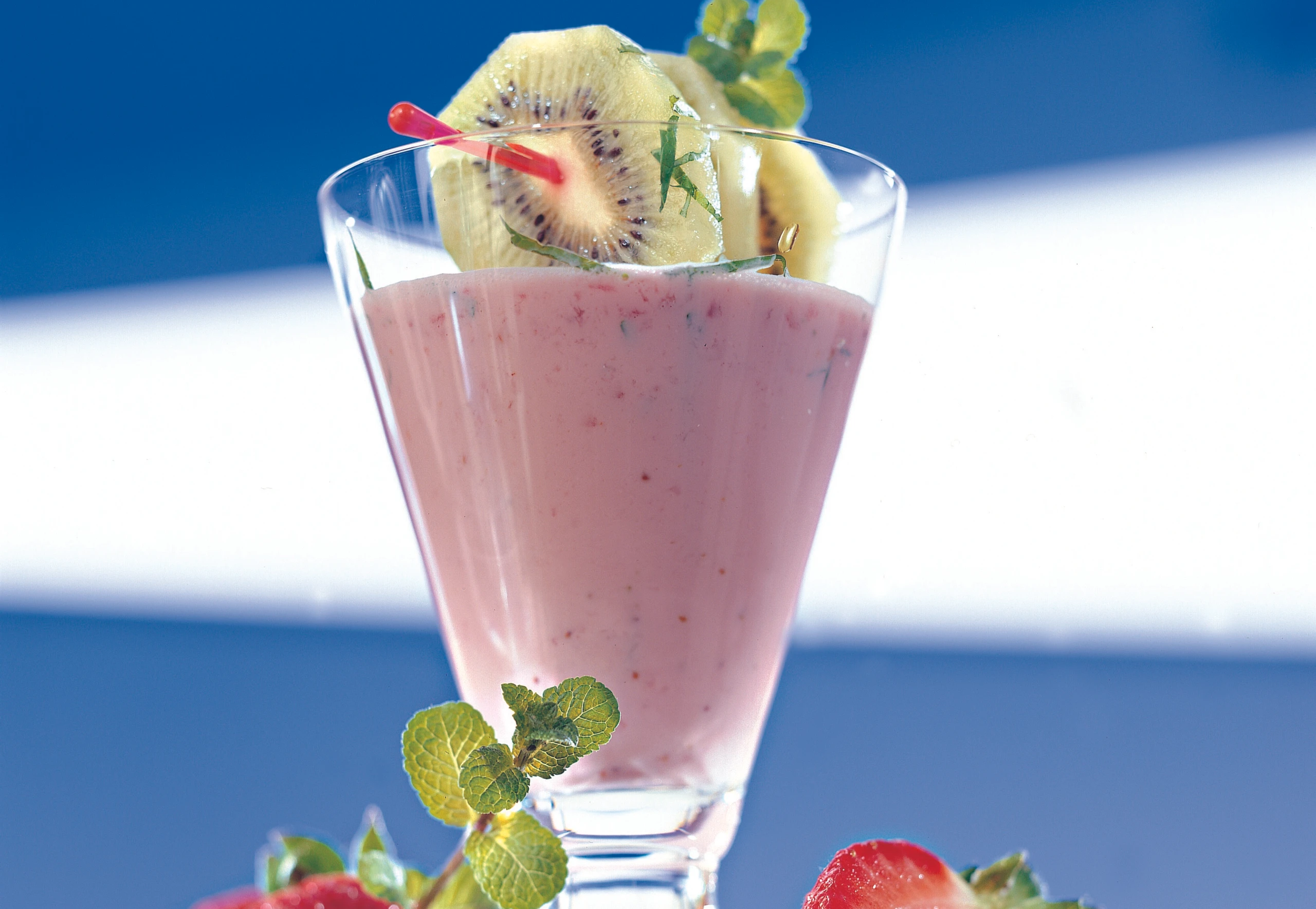 Erdbeeren mit wenig vom Joghurtdrink grob pürieren, übrige Zutaten und Minzestreifen untermischen. Drink in Gläser füllen.