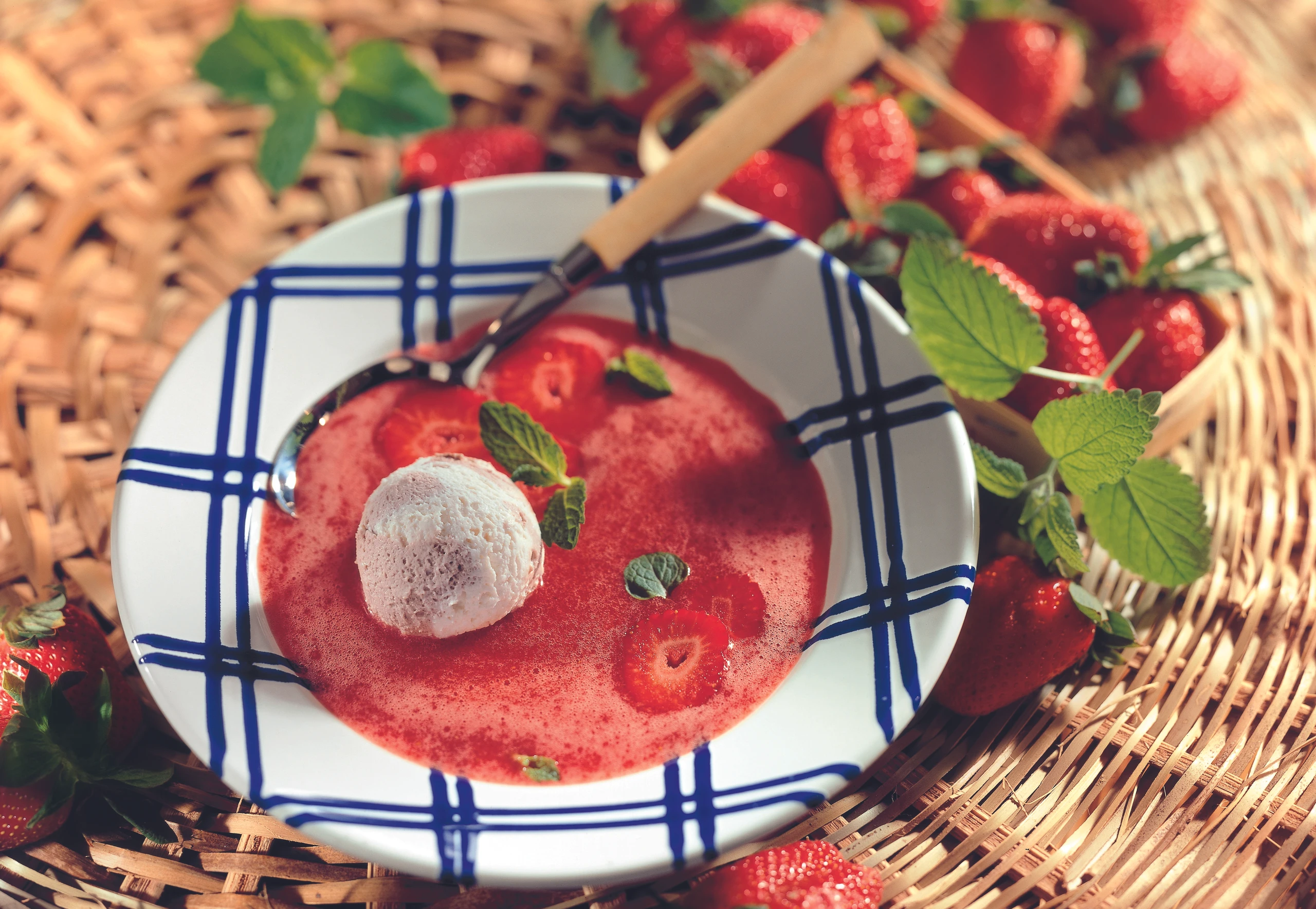 Inzwischen für die Suppe Erdbeeren kurz waschen, putzen und trockentupfen. Erdbeeren in Stücke schneiden und in eine Schüssel geben. 100 ml Wasser mit Zucker aufkochen, mit Zitronensaft vermischen und über die Beeren gießen. Mischung mit einem Stabmixer pürieren, durch ein Sieb streichen und mit Frischhaltefolie zugedeckt kalt stellen.