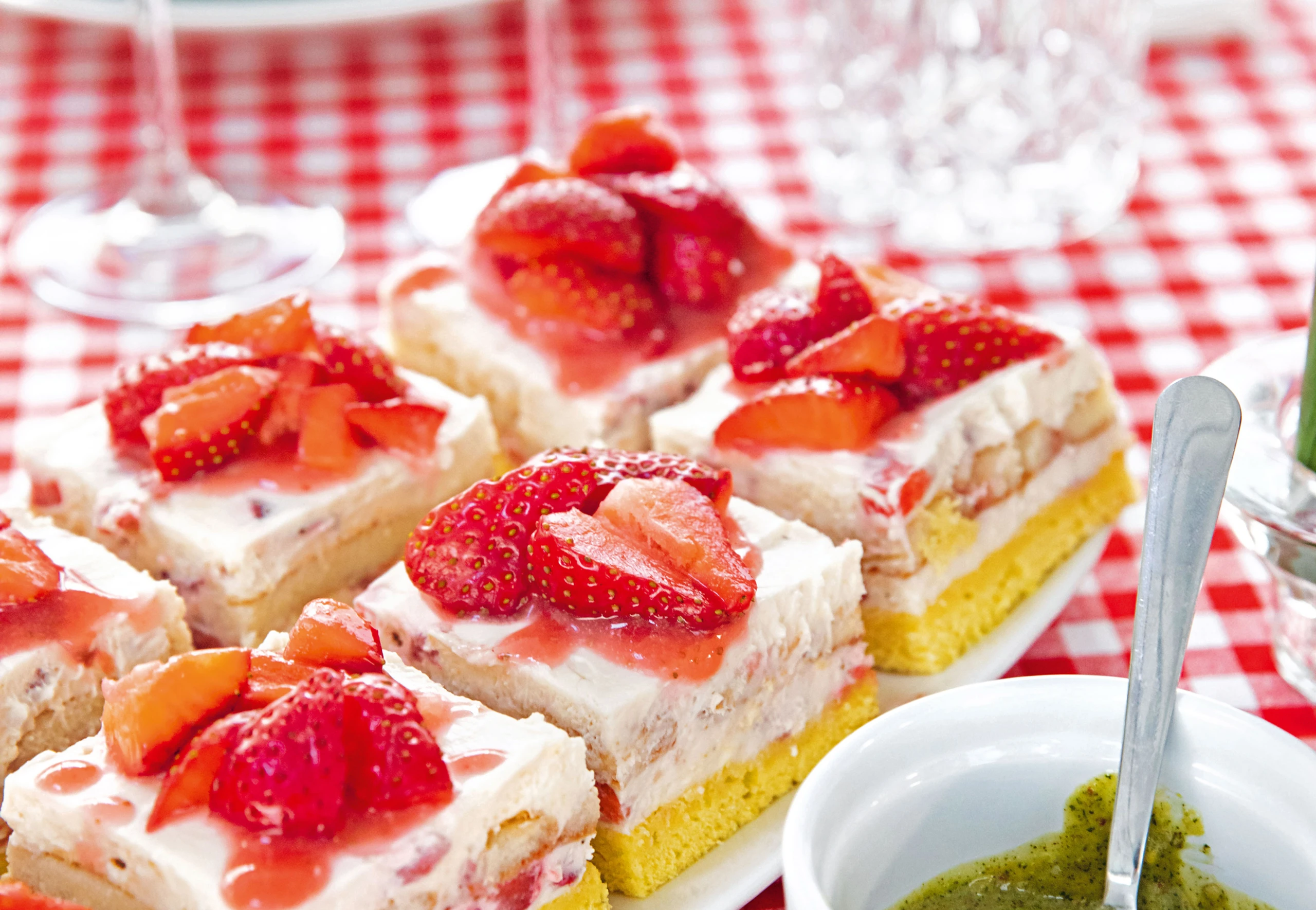 Biskuit in eine Form (35 x 25 cm) legen und mit der Hälfte der Creme bestreichen. Biskotten 5 Sekunden in das Erdbeerpüree tauchen und auf der Creme verteilen. Restliche Creme darauf verstreichen. Tiramisu für ca. 4 Stunden kühl stellen.