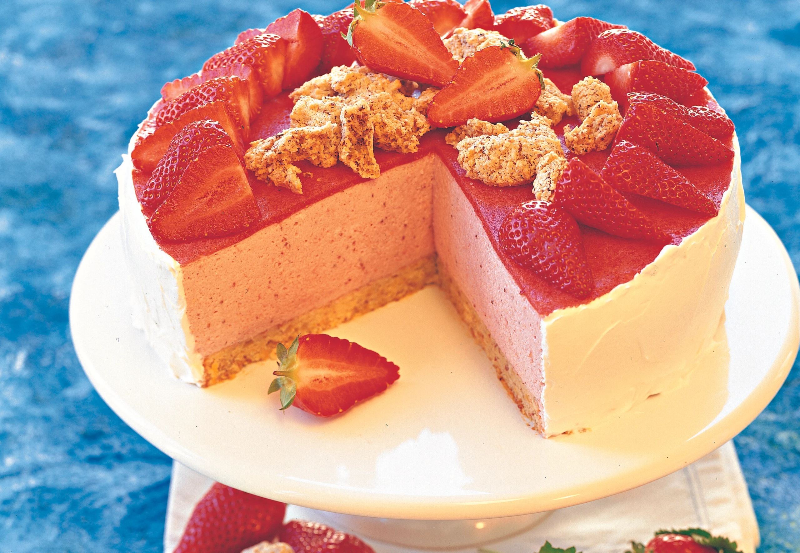 Torte aus der Form nehmen, rundum mit geschlagenem Obers einstreichen, mit Erdbeeren garnieren.