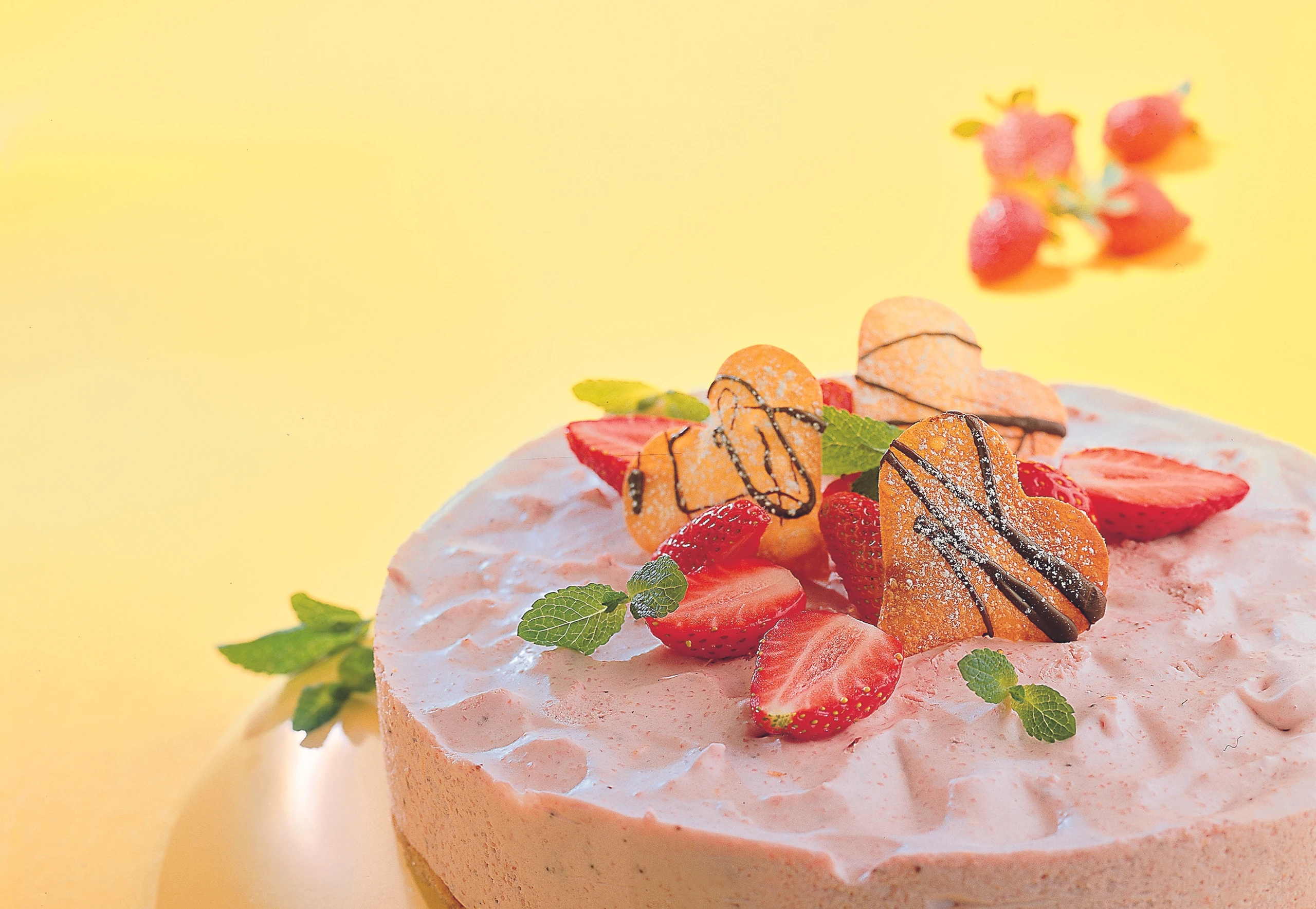 Erdbeeren putzen und in Stücke schneiden. Tortenform abheben. Torte garnieren - zum Beispiel mit Beeren und Minze.
