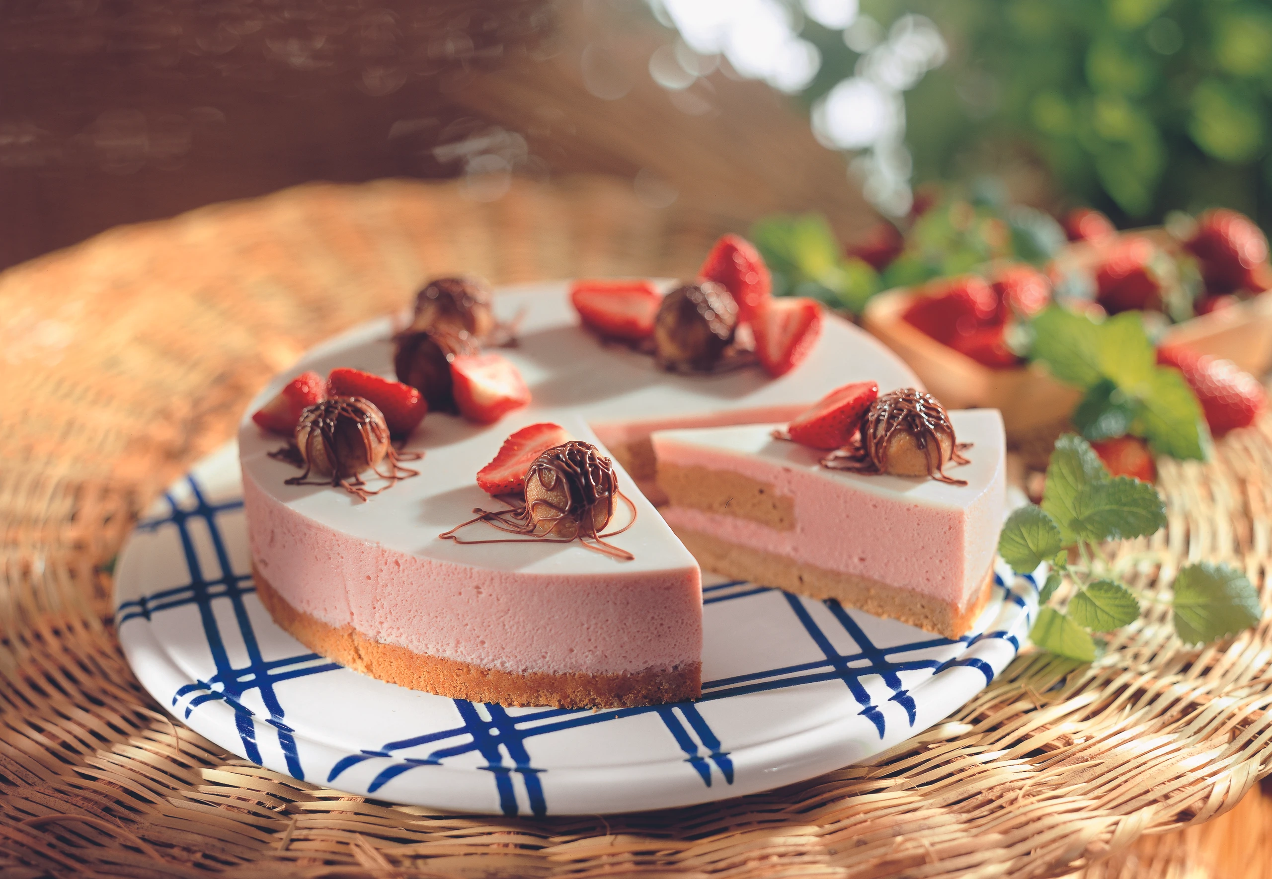 Torte aus der Form lösen und die Folie entfernen. Für die Garnitur Erdbeeren halbieren. Torten mit Erdbeeren und Punschkugeln belegen. Kuvertüre über Wasserdampf schmelzen, in ein kleines Papierstanitzel oder ein Plastiksackerl (eine Ecke abschneiden) füllen und die Torte damit verzieren. Torte nochmals kurz kühlen.