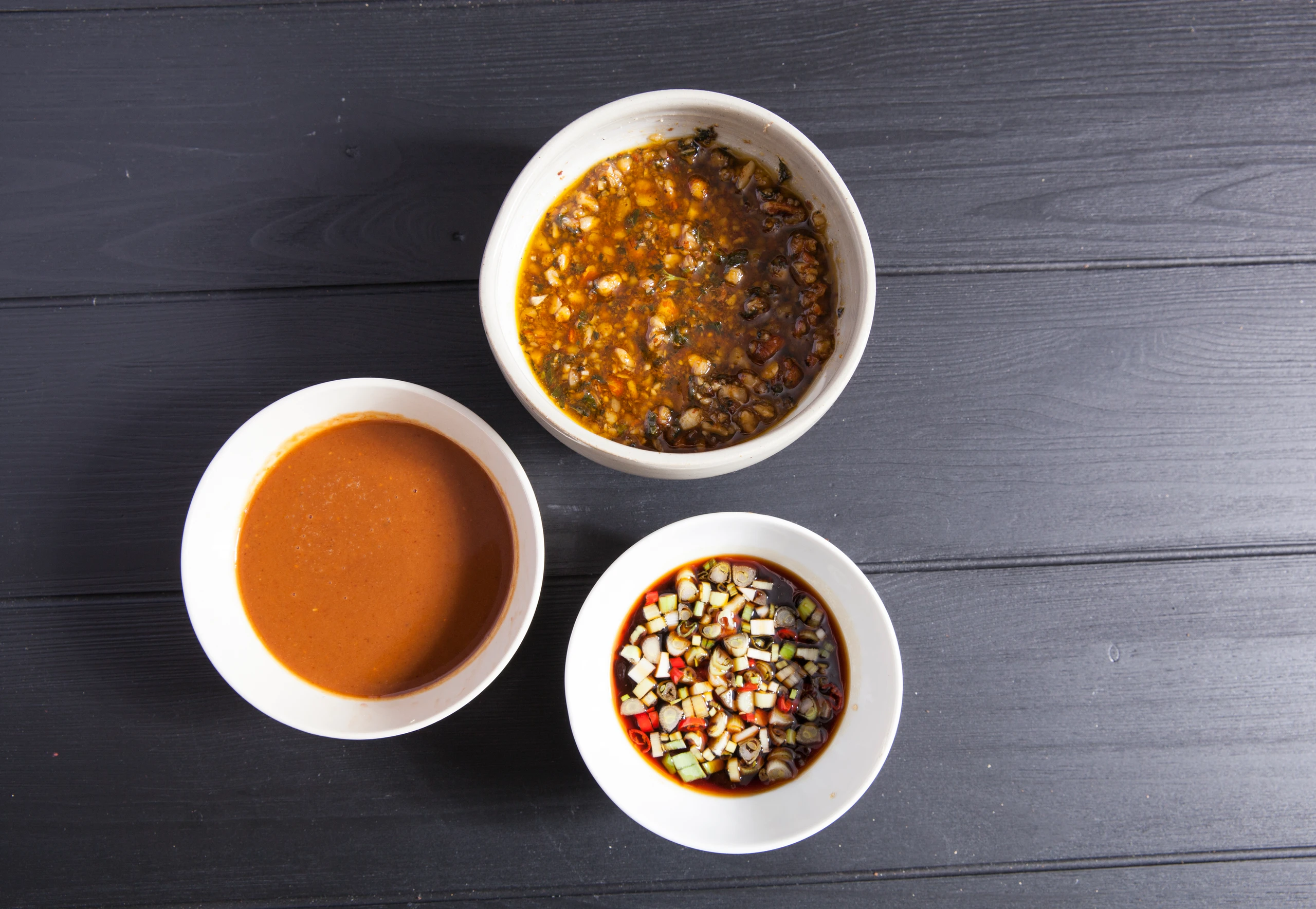 Knoblauch schälen und möglichst fein würfeln. Öl in einem kleinen Topf erhitzen, Knoblauch darin leicht anbraten. Mit Wasser aufgießen, danach Erdnussbutter und braunen Zucker einrühren.