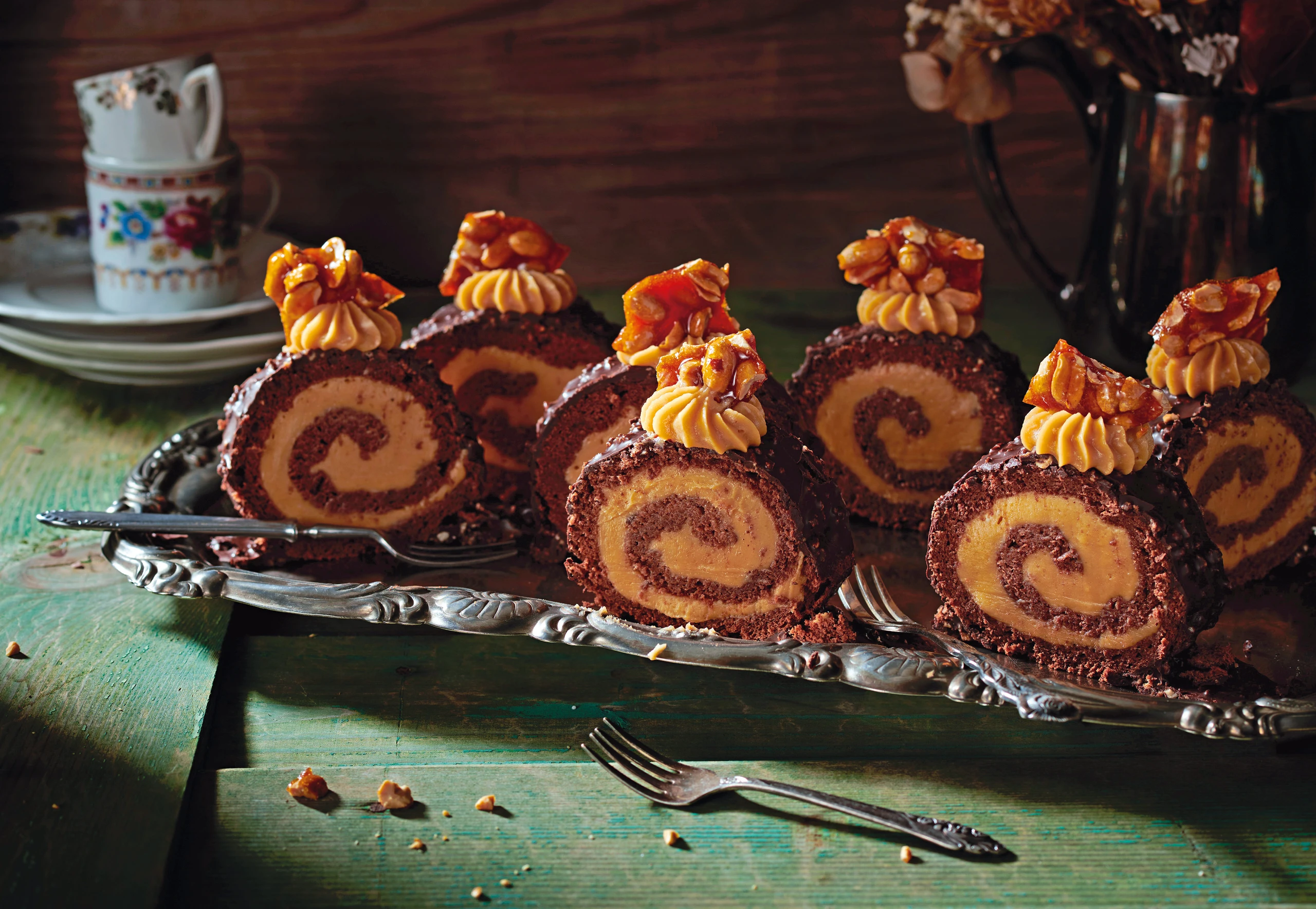 Erdnussbutter-Brownie-Roulade mit Karamell-Crunch