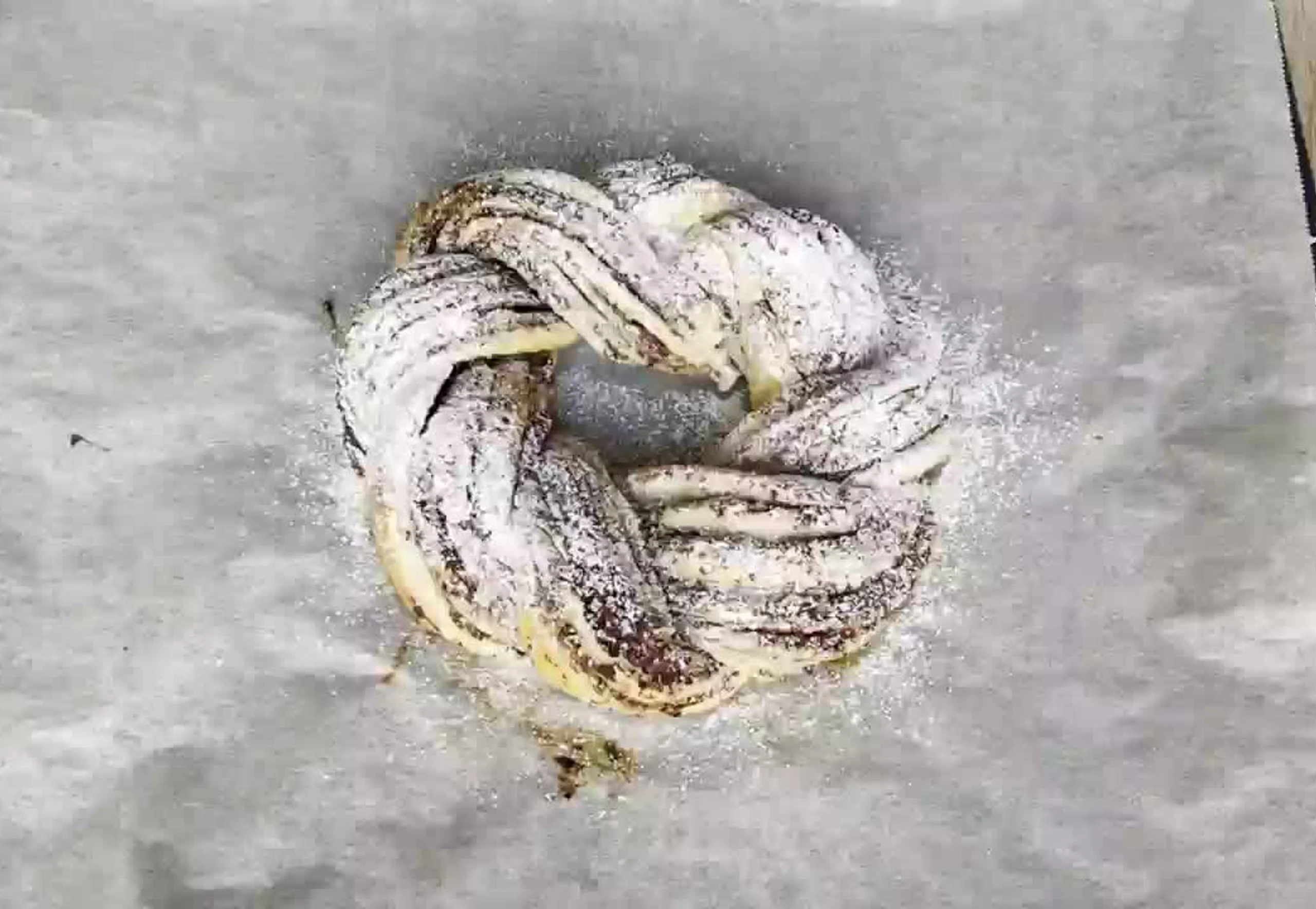 Kranz mit Ei bestreichen und im Rohr (mittlere Schiene) ca. 25 Minuten backen. Herausnehmen und auskühlen lassen, mit Staubzucker bestreut servieren.