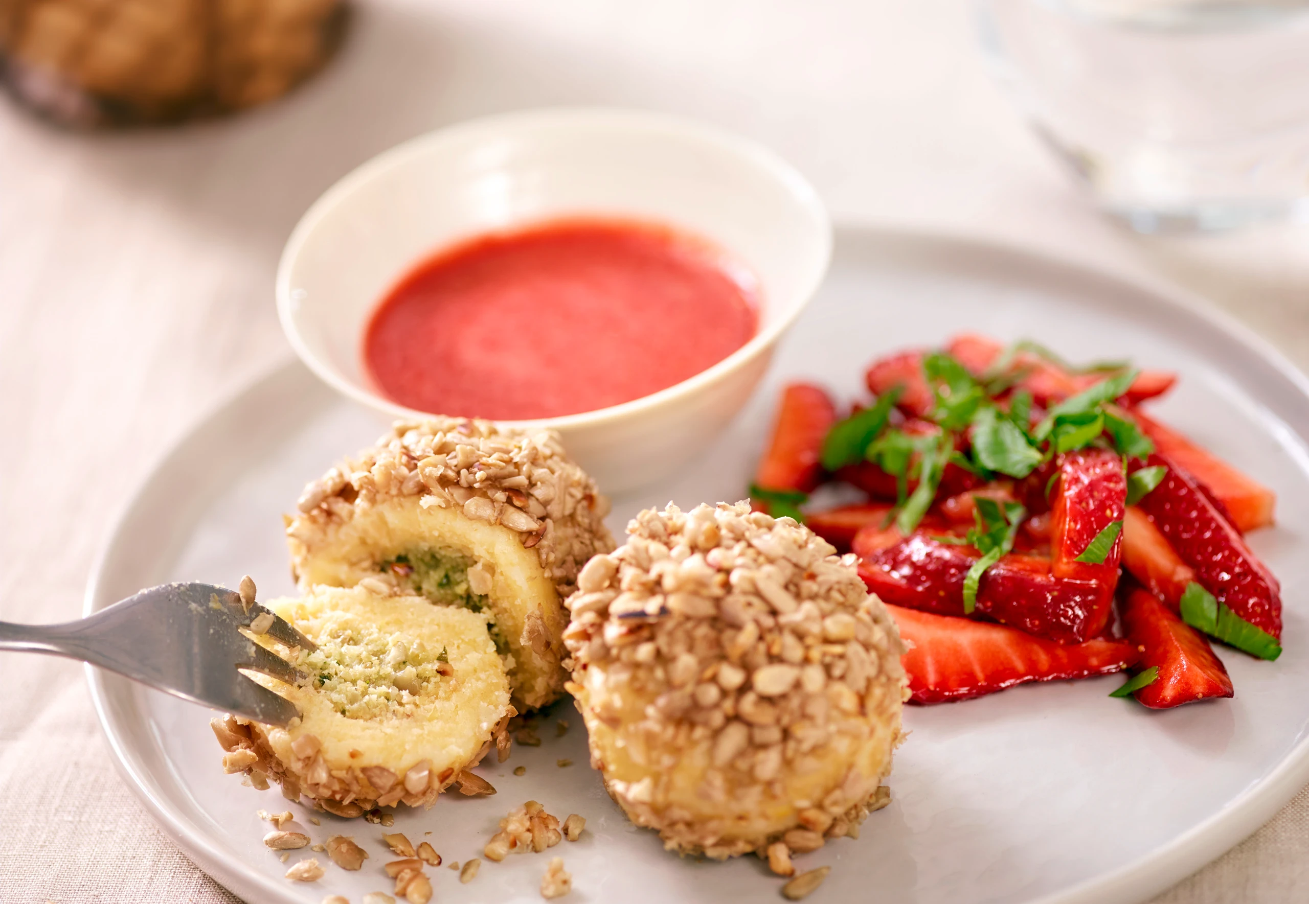 Knödel mit einem Gitterlöffel aus dem Wasser heben, abtropfen lassen und in den gehackten Sonnenblumenkernen wälzen. Knödel mit Erdbeersalat und Erdbeersauce anrichten.