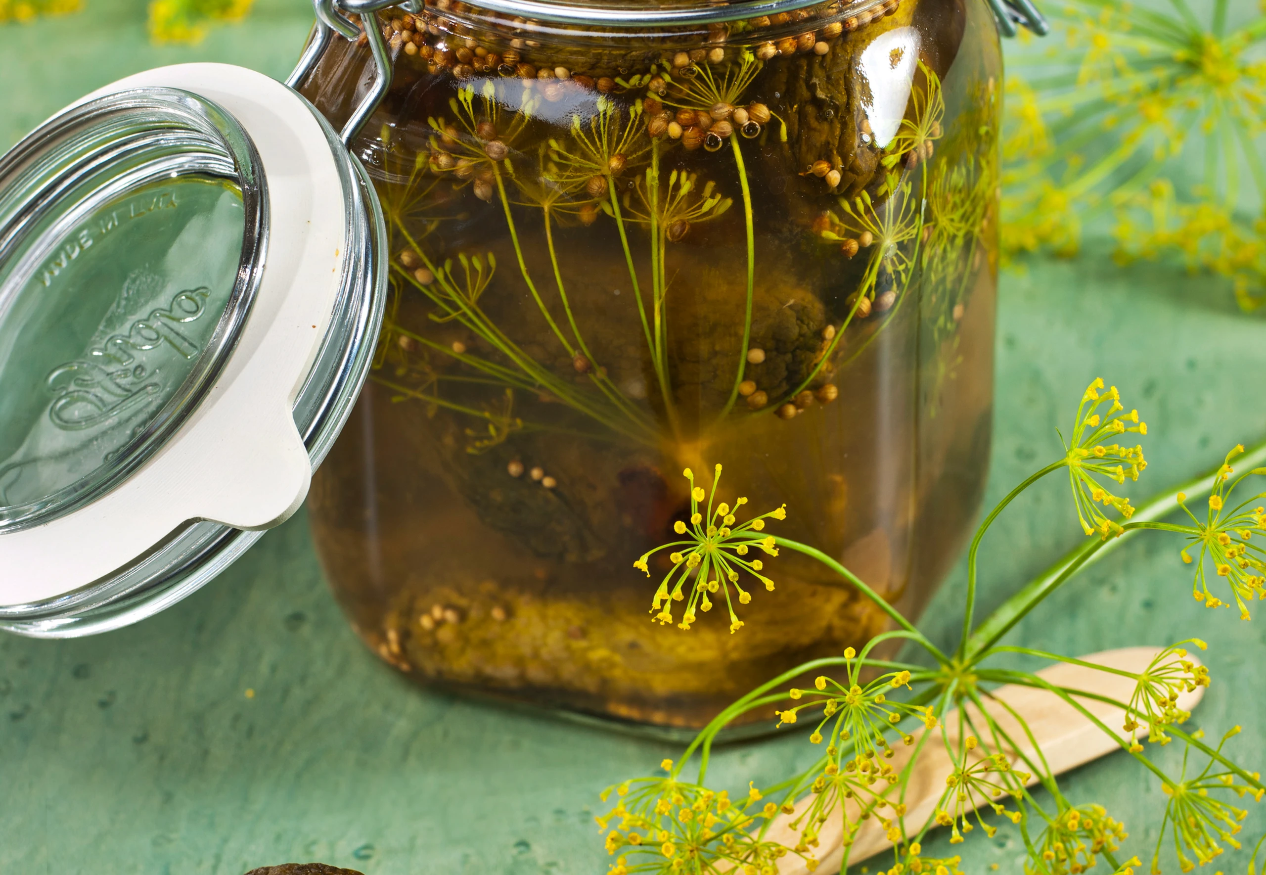Gurken waschen. Essig mit Wasser, Zucker, Salz und Gewürzkörnern aufkochen, Gurken zugeben und einmal aufkochen. Gurken, Estragon und Dille in den Gläsern verteilen, mit dem kochend heißen Essigsud bedecken. Gläser sofort verschließen. 3 Monate kühl und dunkel lagern, danach sind sie essfertig.