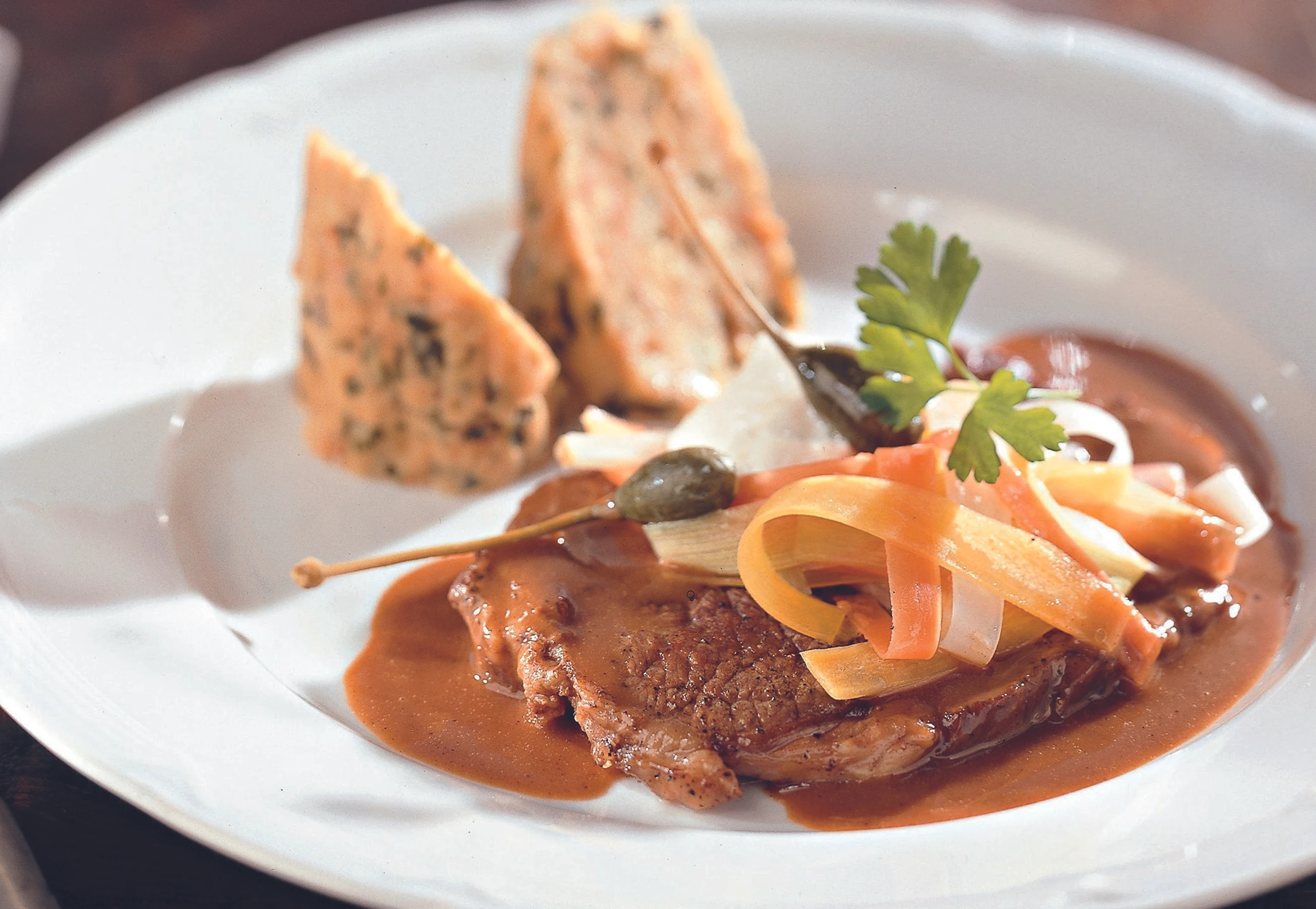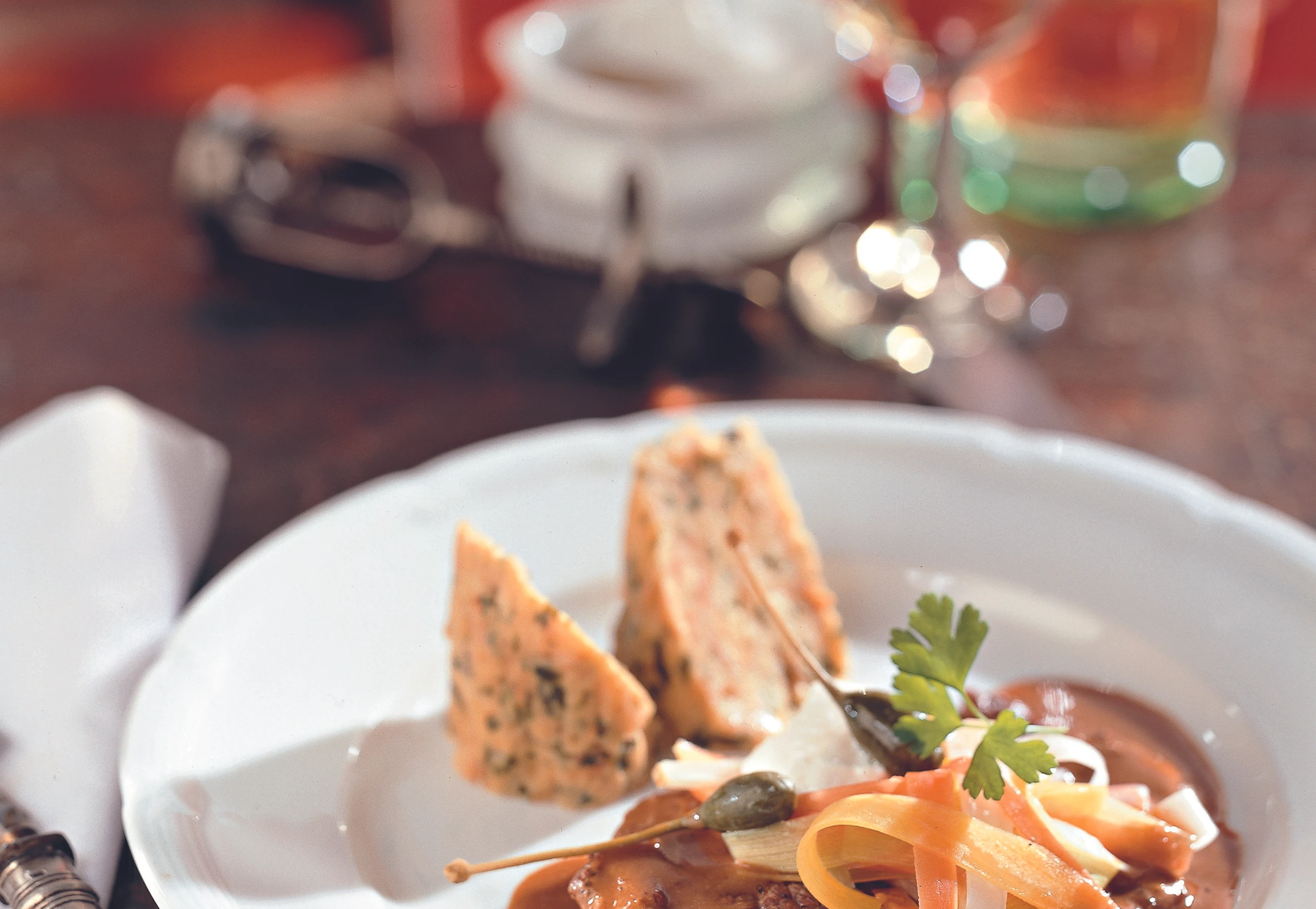 Fleisch herausnehmen und im Rohr warm stellen. Rahm mit Mehl glatt rühren, die Sauce damit binden. Sauce aufkochen, pürieren und abseihen. Fleisch in der Sauce erwärmen. Gemüse erwärmen. Fleisch mit Sauce, Gemüse, Kapernbeeren, Petersilie und Knödeln garnieren.