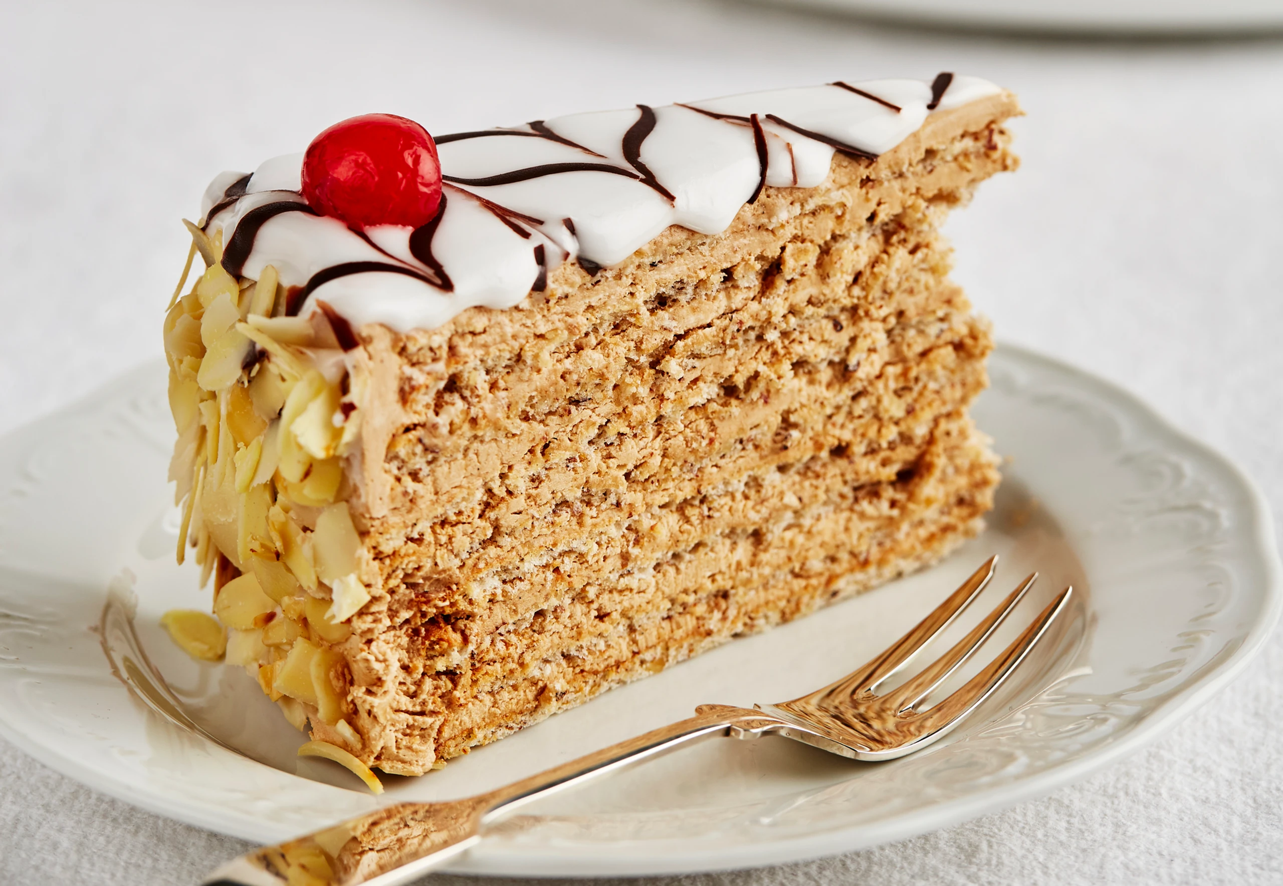 Für die Deko Mandeln in einer trockenen Pfanne goldbraun rösten. Herausnehmen und auskühlen lassen. Fondantglasur über einem Wasserbad schmelzen und evtl. mit etwas heißem Wasser verdünnen. Fondant auf der Torte verteilen und glatt streichen. Kuvertüre in ein Papierstanitzel füllen und gerade Linien auf die noch feuchte Oberfläche spritzen. Für das typische Muster einen Spieß durch die Glasur ziehen. Cocktailkirschen auf die Torte setzen und den Rand mit Mandeln einstreuen.