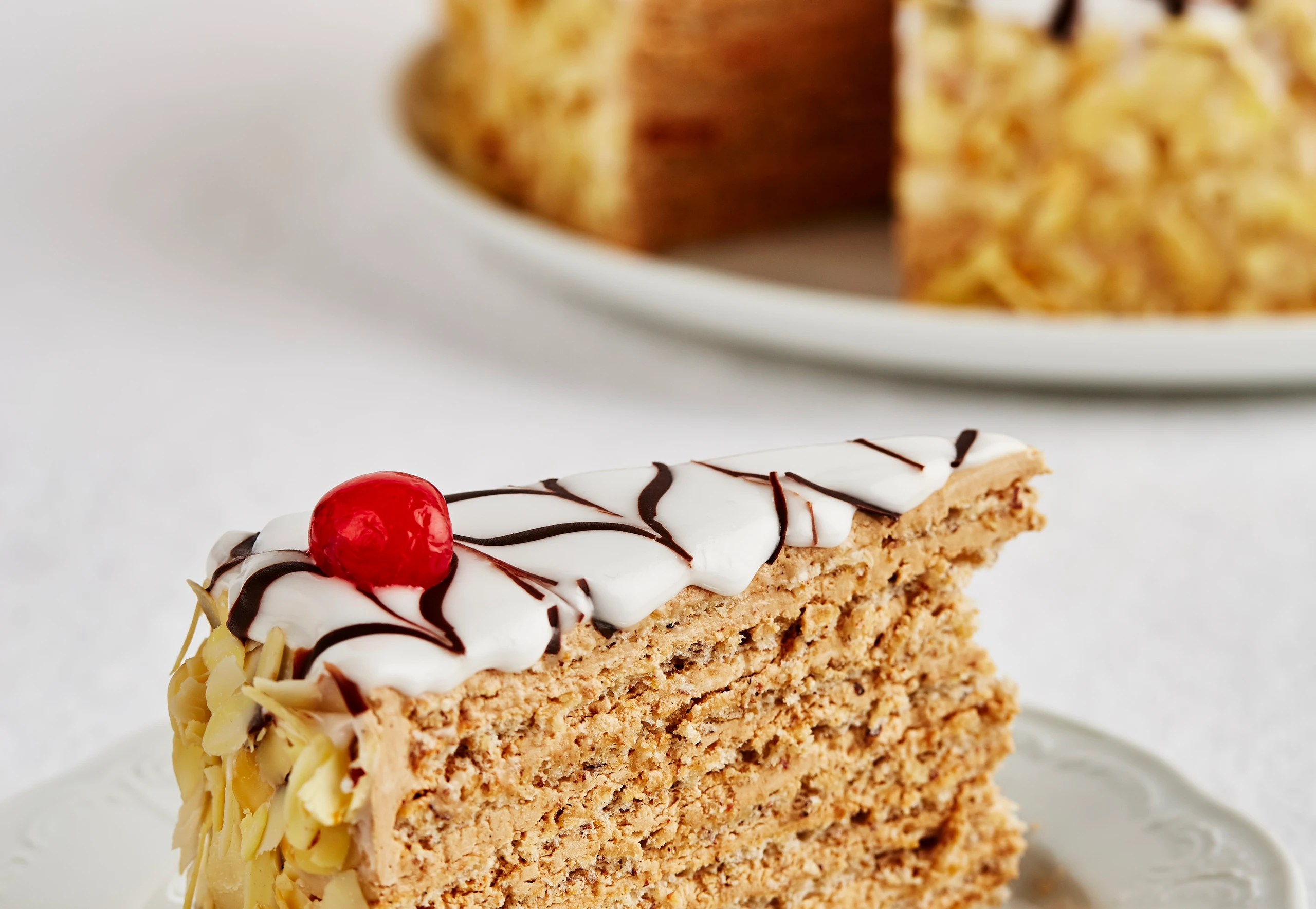 Auf 9 Tortenböden je ca. 1 ½ EL Creme verstreichen und übereinandersetzen. Zehnten Boden darauflegen und leicht andrücken. Torte rundum mit der übrigen Creme einstreichen und für mind. 5 Stunden (am besten über Nacht) kalt stellen.