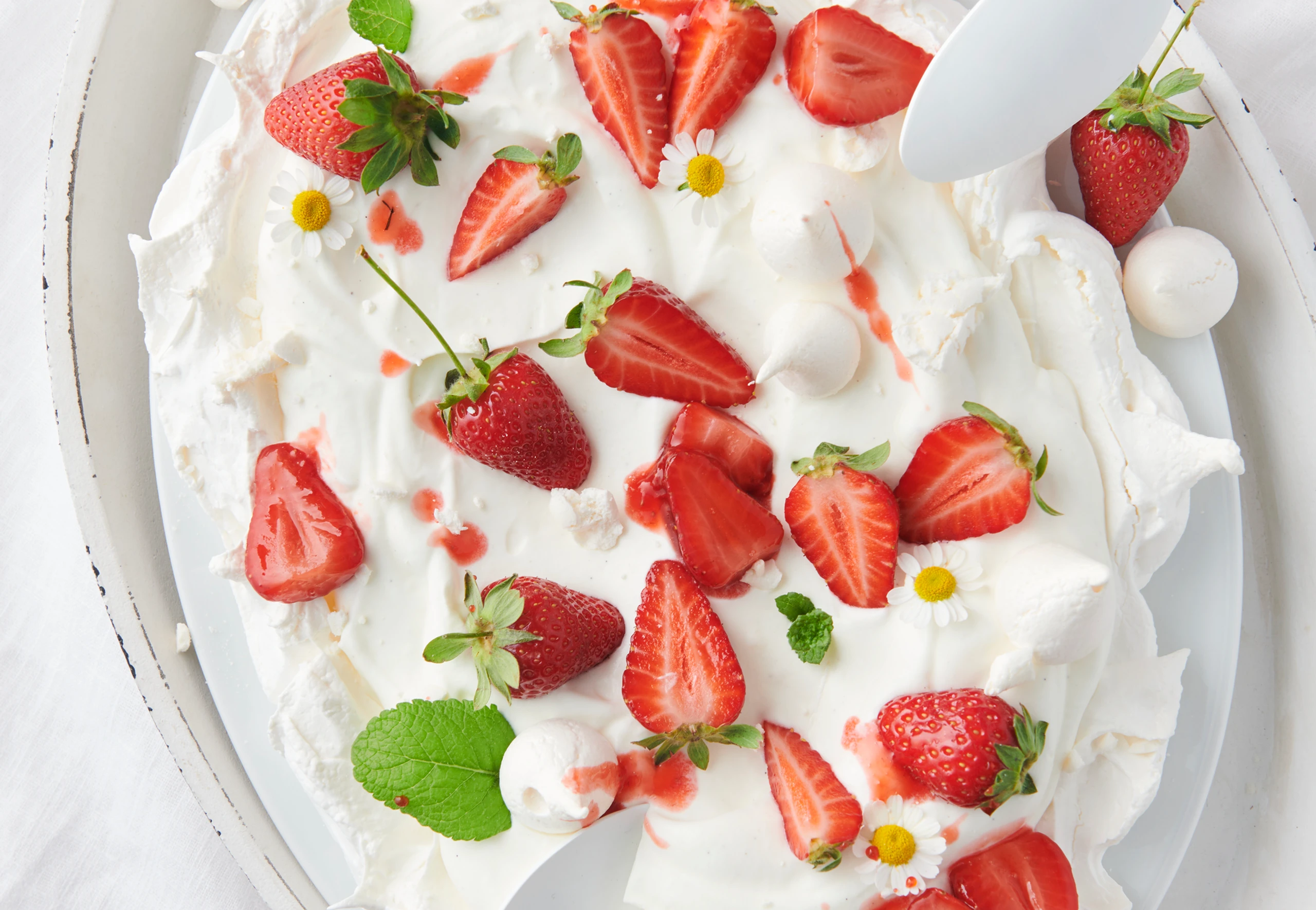 Für die Creme Obers aufschlagen, Vanillepaste unterrühren und mit dem Joghurt vermischen. Creme auf dem Baiser verstreichen und etwas Beerenröster darauf verteilen. Mit frischen Erdbeeren, Mini-Baisers und Blüten verzieren. Restlichen Röster dazu reichen.