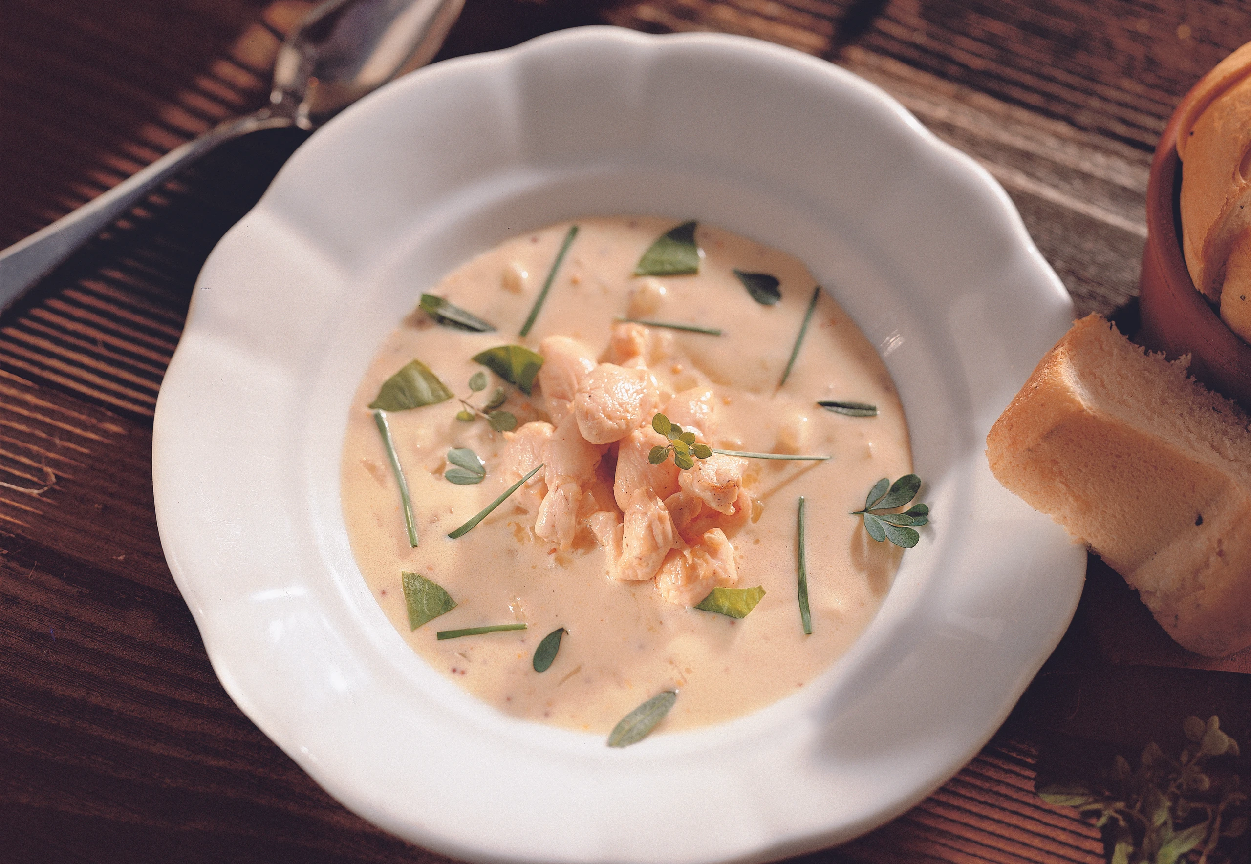 Suppe mit Obers vollenden, anrichten, mit den frisch gezupften Kräutern bestreuen. Fleisch einlegen.