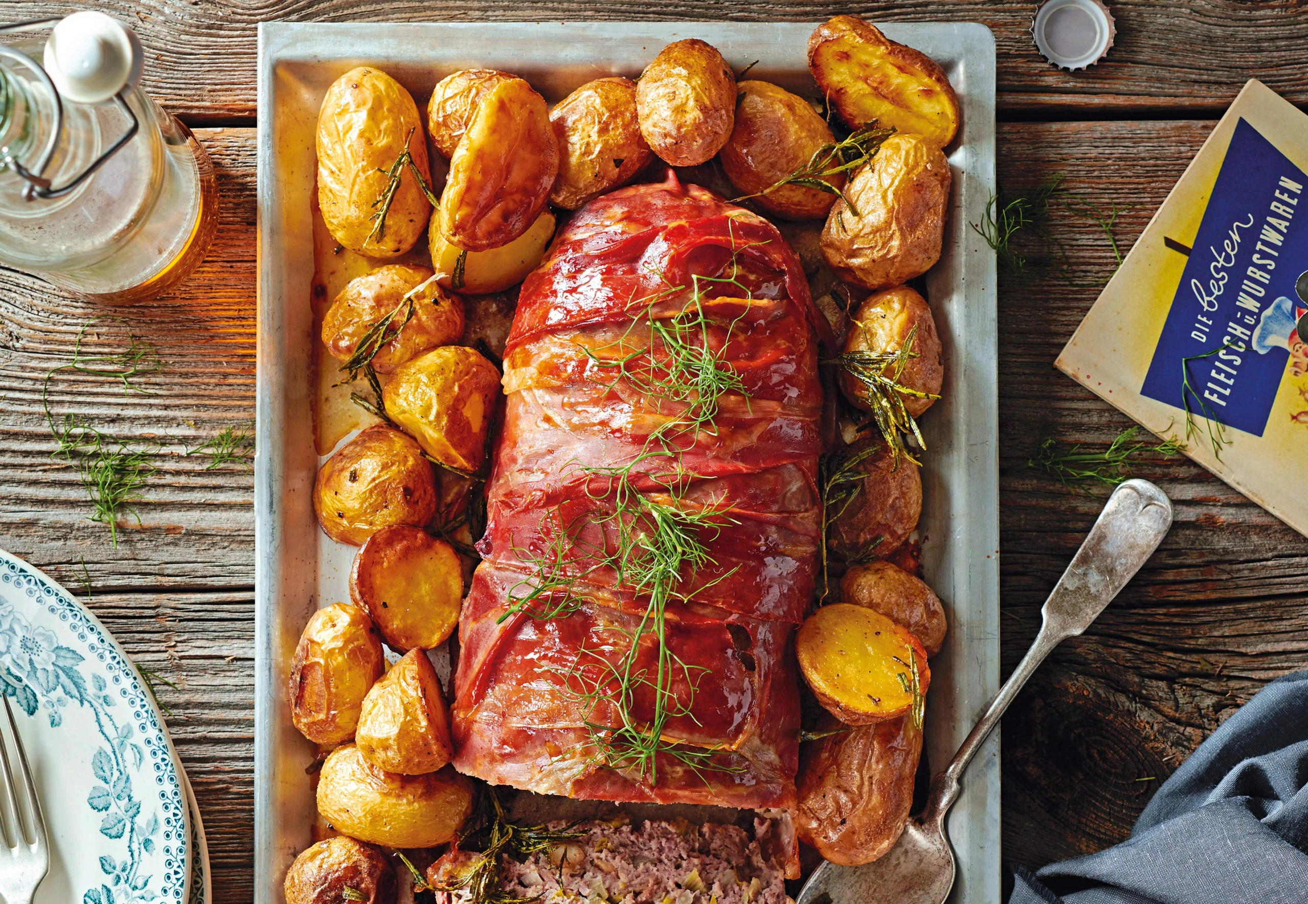 Rohr auf 180°C Umluft vorheizen. Faschierte Masse auf einem Blech zu einem länglichen Laib formen und mit Prosciutto umwickeln.