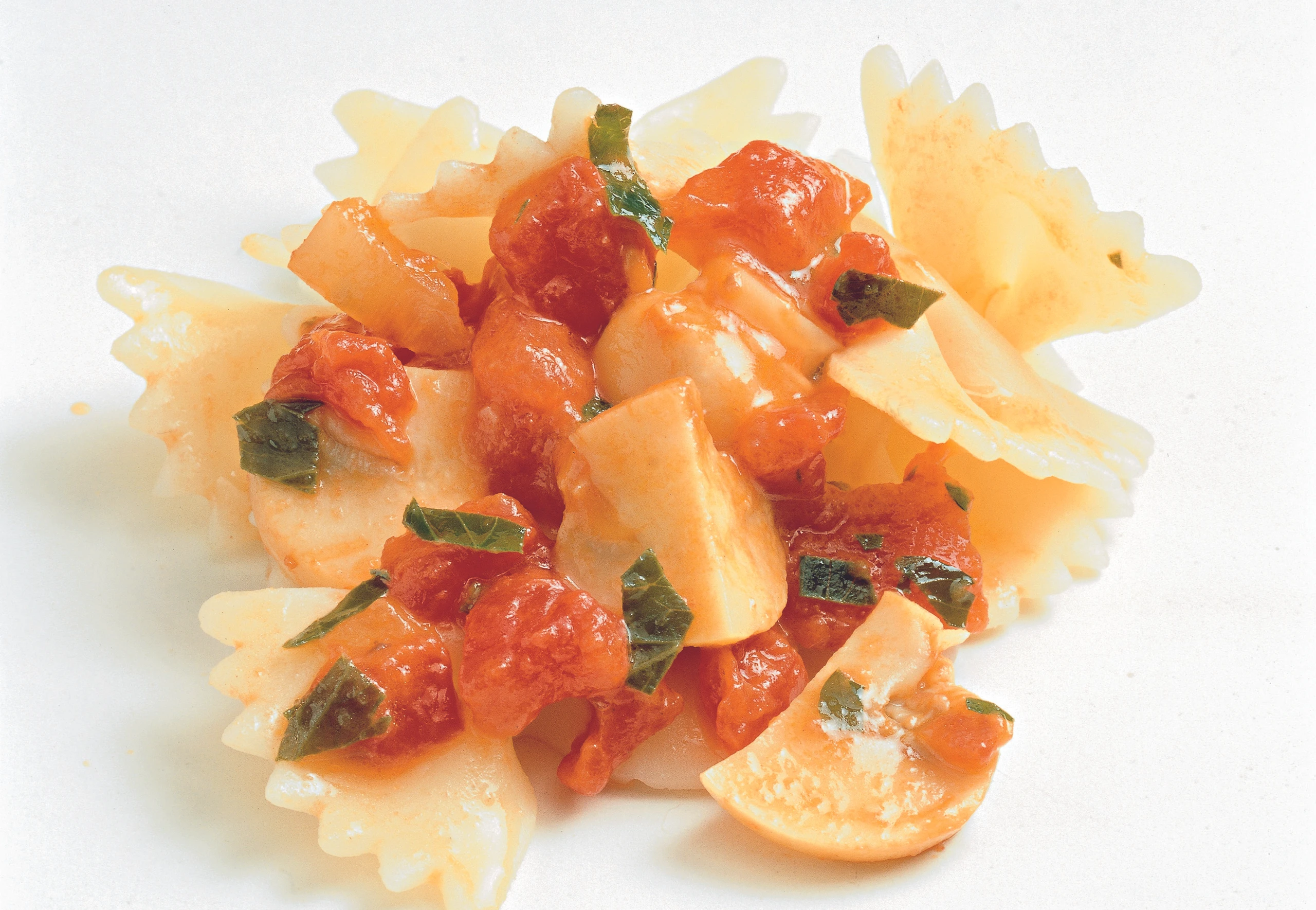 Paradeiser abseihen, Saft auffangen. Paradeiser in kleine Stücke schneiden. Zwiebel schälen und kleinwürfelig schneiden. Champignons putzen, kurz waschen und in gleichgroße Stücke schneiden. Butter bis zum Aufschäumen erhitzen, Zwiebel und Champignons darin anschwitzen. Petersilie, Paradeiserstücke und -saft zugeben. Sauce aufkochen, zudecken und auf kleiner Flamme ca. 1/2 Stunde köcheln. Sauce mit Salz und Pfeffer würzen. Farfalle in Salzwasser bissfest kochen, abseihen, abtropfen lassen und mit der Sauce vermischen.