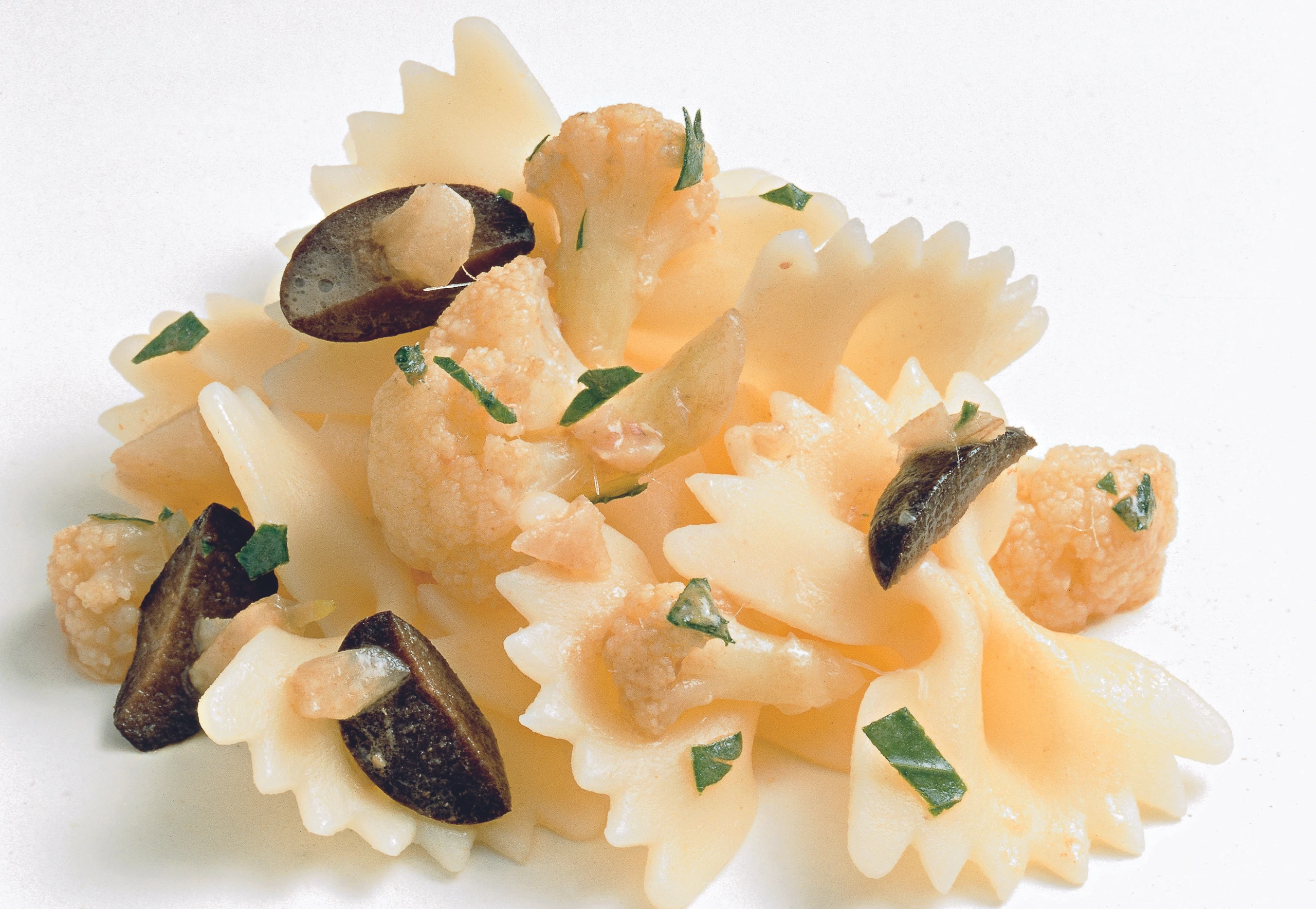 Knoblauchzehen schälen, Oliven entkernen. Sardellenfilets, Knoblauch und Oliven in kleine Stücke schneiden und in Butter anschwitzen. Karfiolröschen untermischen und mit Salz und Pfeffer würzen. Inzwischen Farfalle in Salzwasser bissfest kochen, abseihen, kurz abtropfen lassen und mit dem Gemüse vermischen.