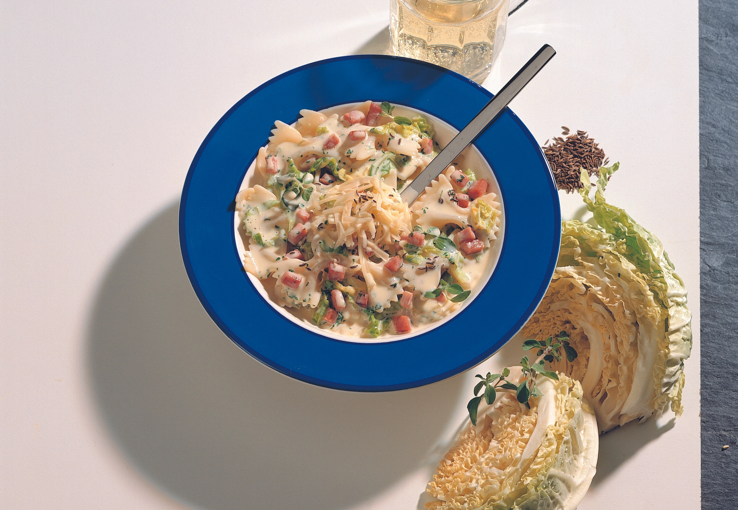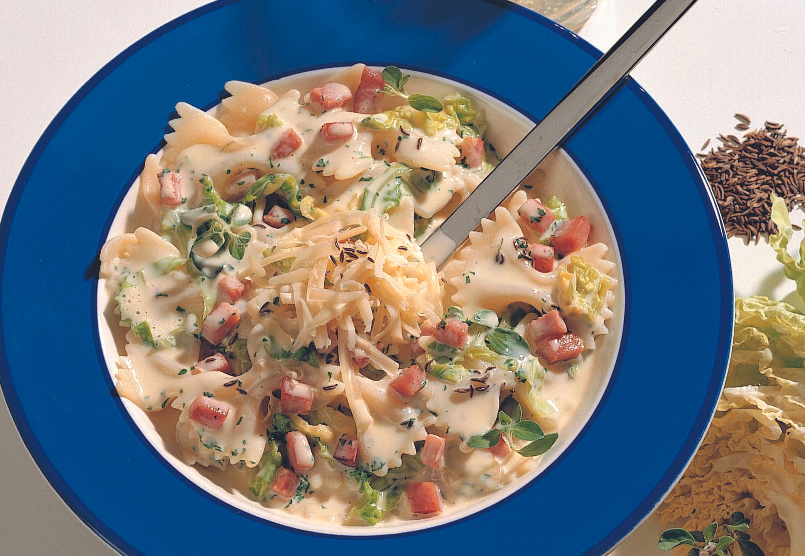 Speck kleinwürfelig schneiden und in 1 EL Butter oder Margarine anschwitzen, Kohl untermischen. Suppe zugießen und die Sauce auf kleiner Flamme ca. 2 Minuten köcheln. Sobald der Kohl bißfest ist, Nudeln und Kräuter untermischen und mit Salz, Pfeffer, Majoran und Kümmel würzen. Farfalle mit Käse bestreut servieren.