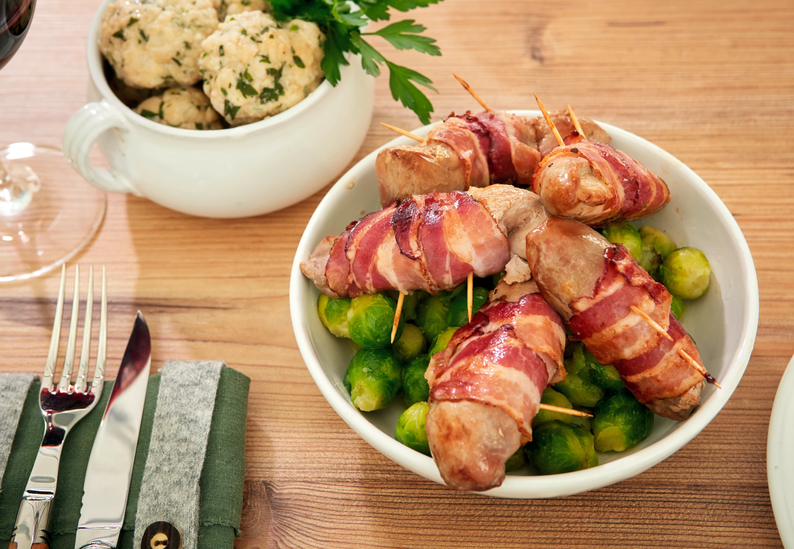 Fasan im Speckmantel mit Kohlsprossen und Knödeln