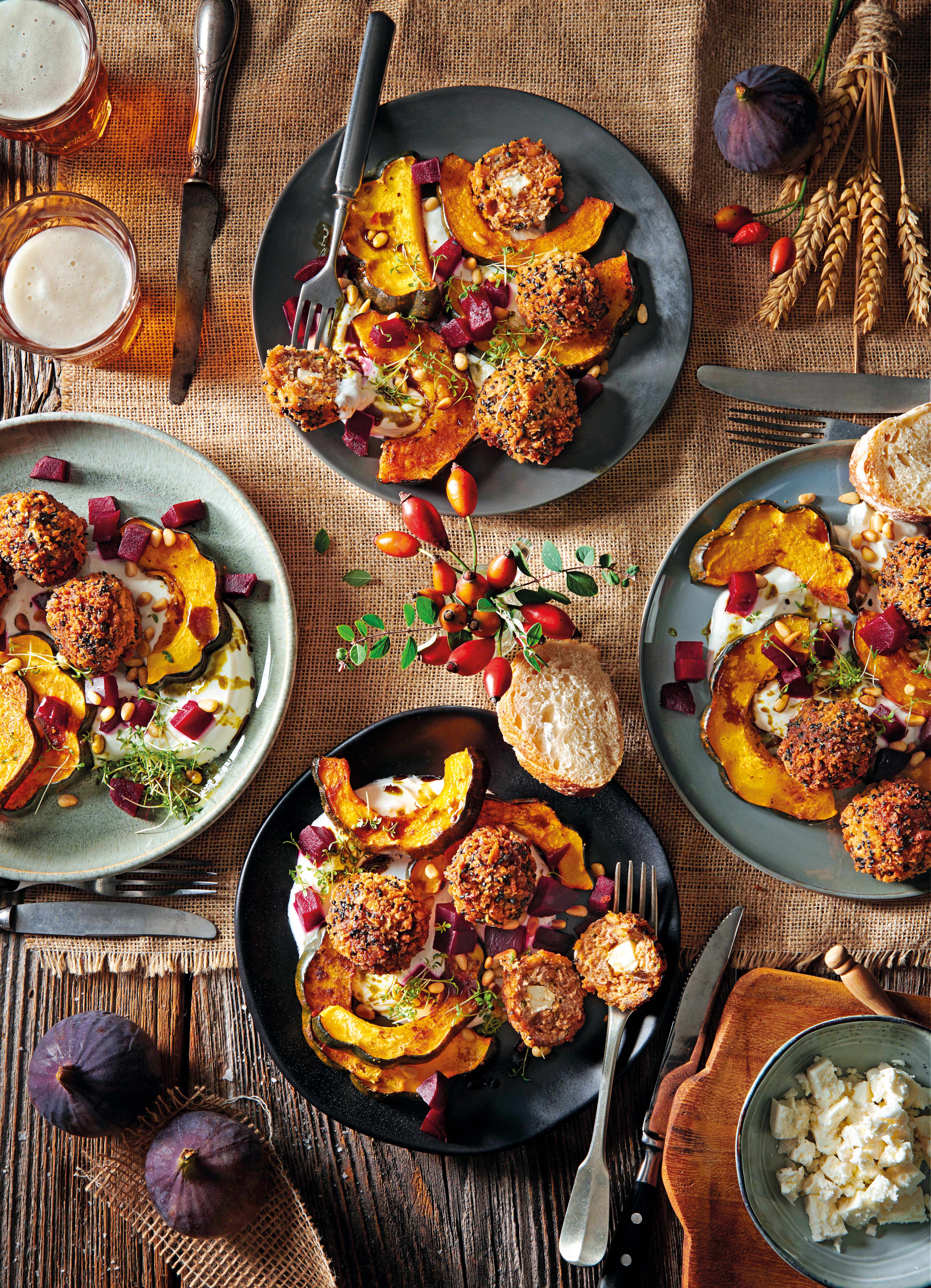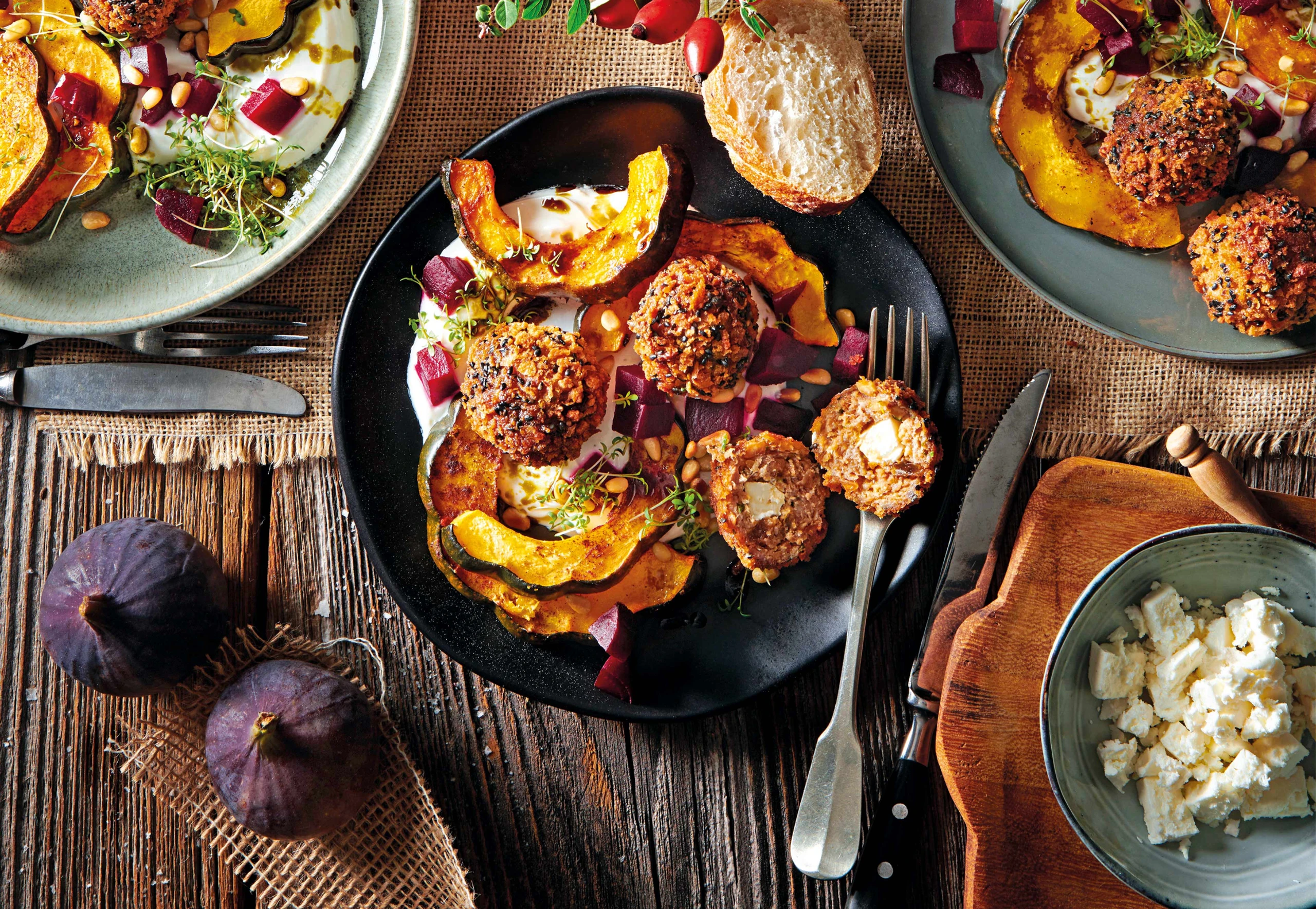Faschierte Bällchen mit Feta, Eichelkürbis & Zitronenjoghurt