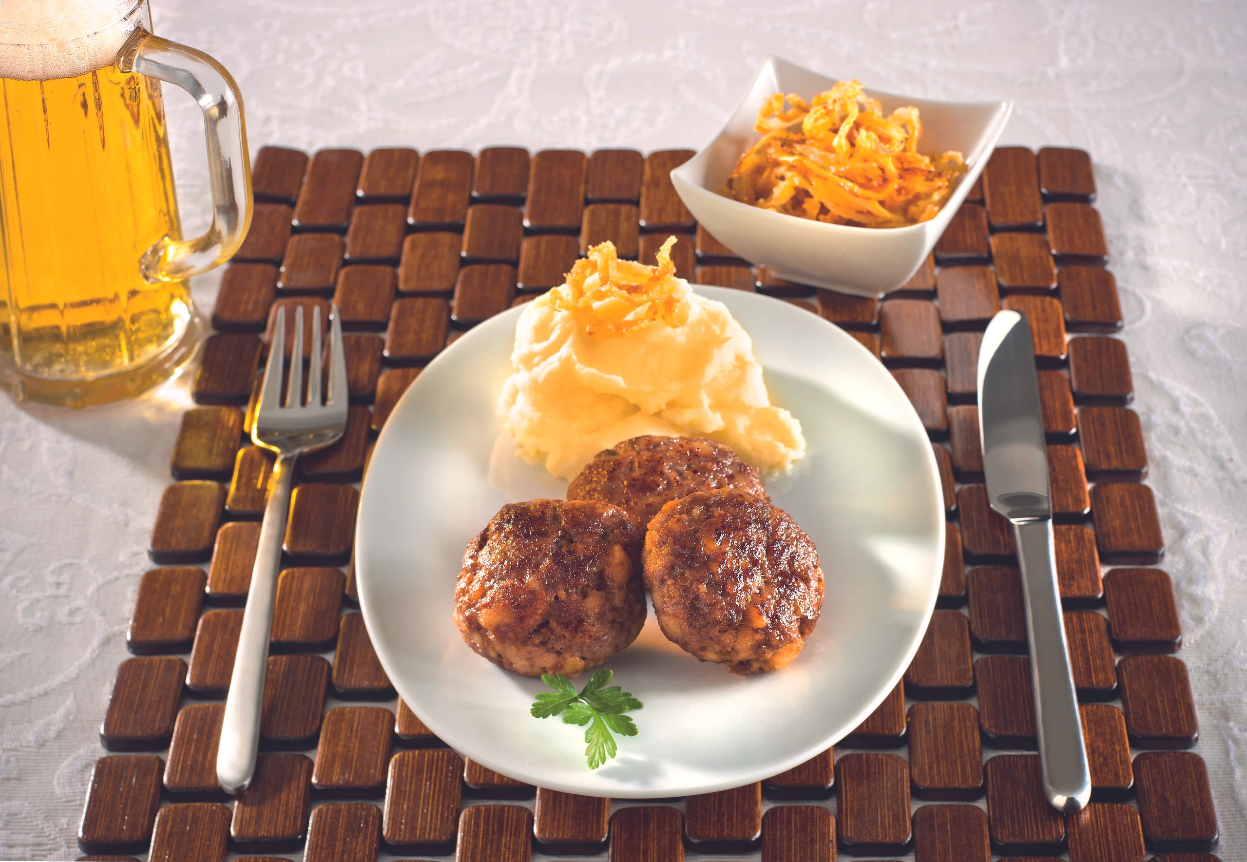 Laibchen im Öl bei schwacher Hitze beidseitig braten (gesamt ca. 3 Minuten). Herausnehmen, abtropfen lassen und mit dem Püree anrichten. Püree eventuell mit Röstzwiebeln garnieren.