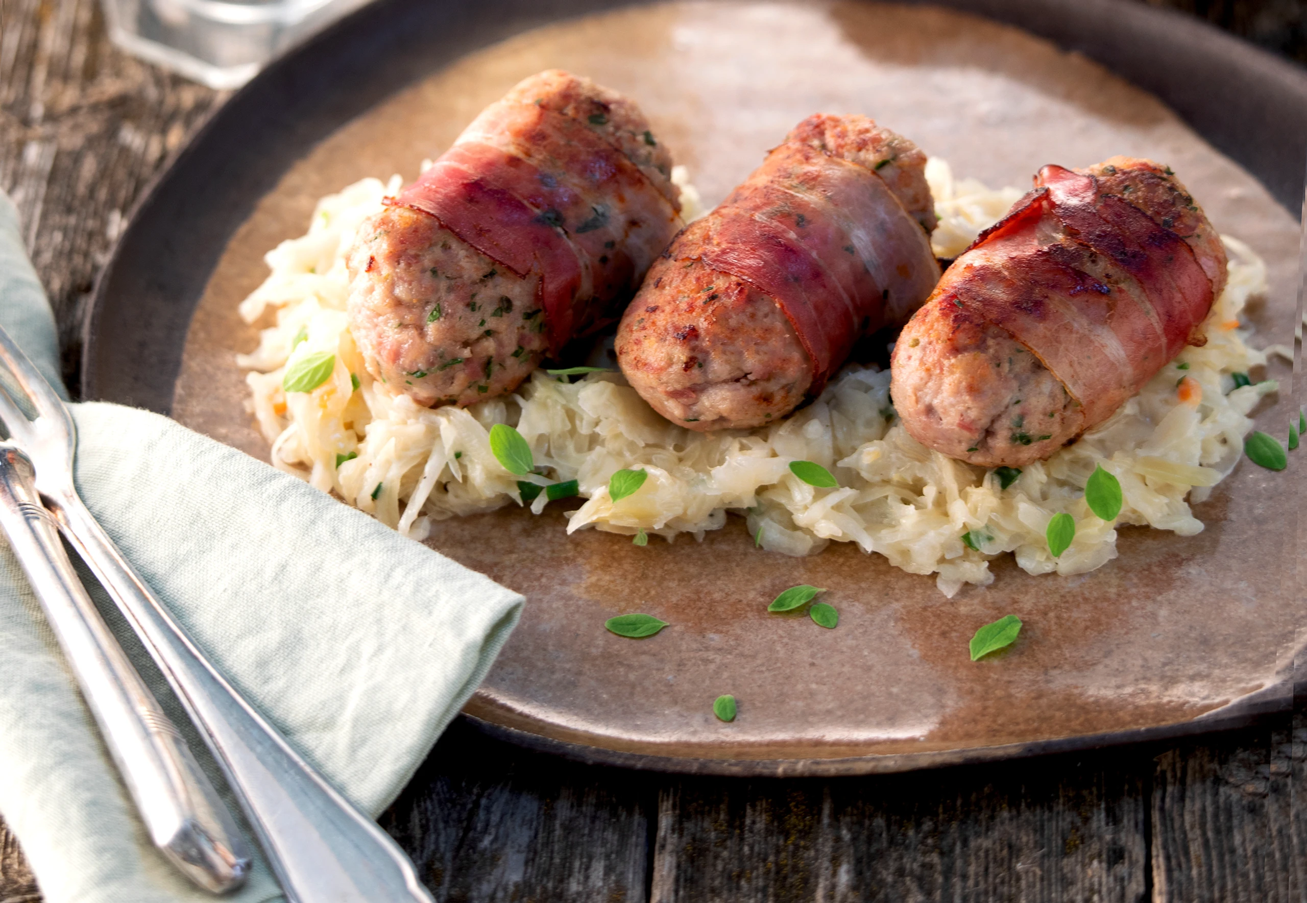 Faschierte Röllchen im Speckmantel mit Rahmkraut
