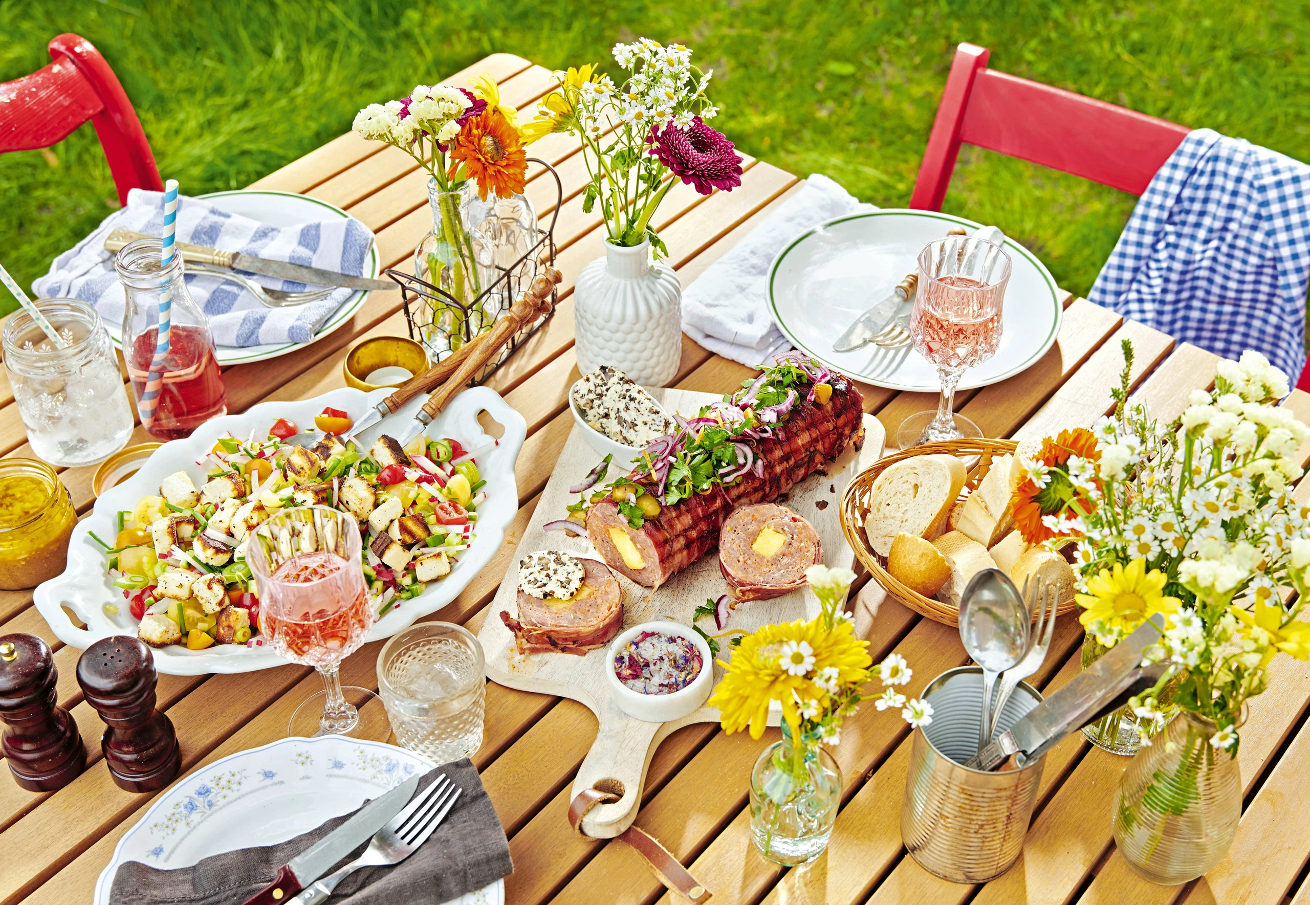 Roulade ohne Folie rundum scharf angrillen, auf eine kühlere Zone am Rost legen und zugedeckt ca. 30 Minuten garen. Gelegentlich wenden.