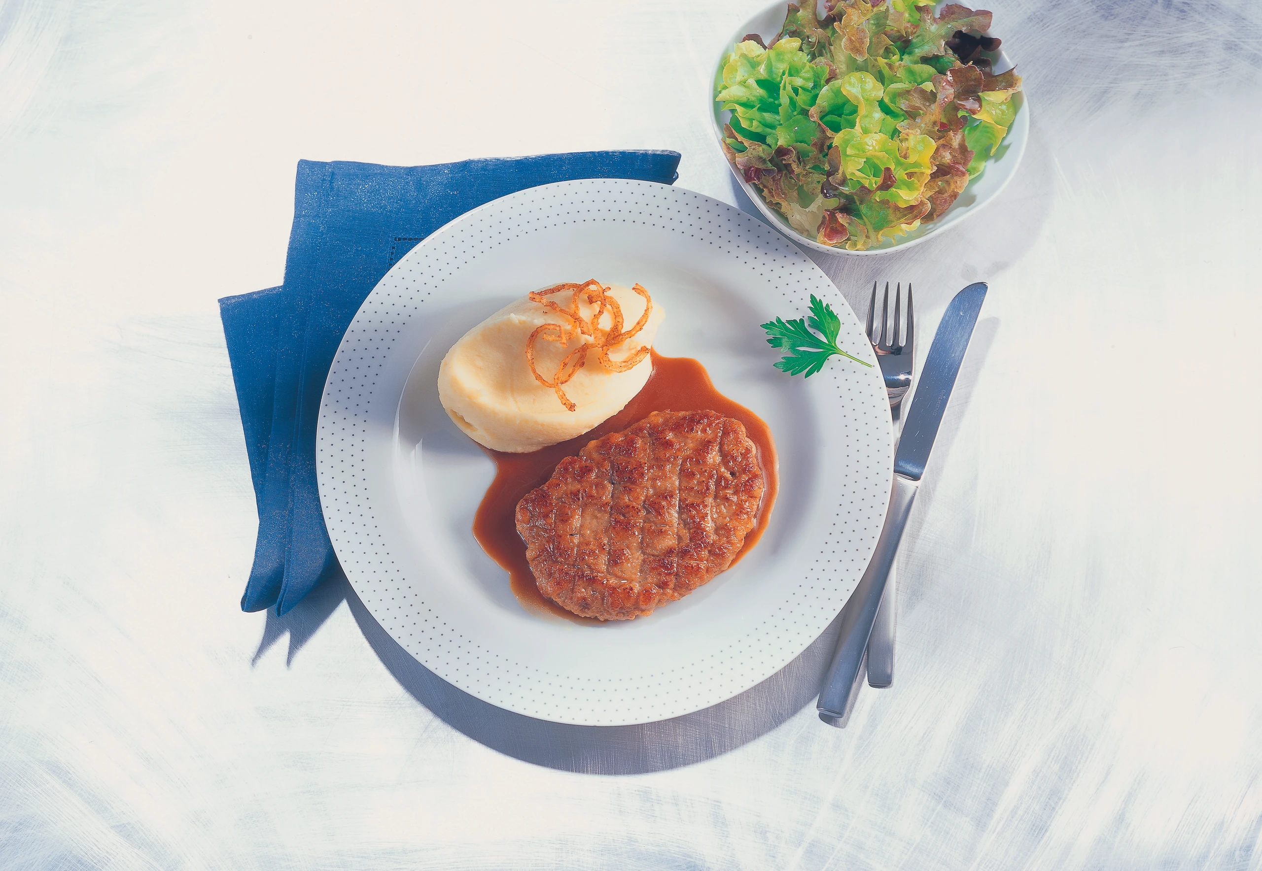 Faschiertes Butterschnitzel mit Erdäpfelpüree und Eichblattsalat