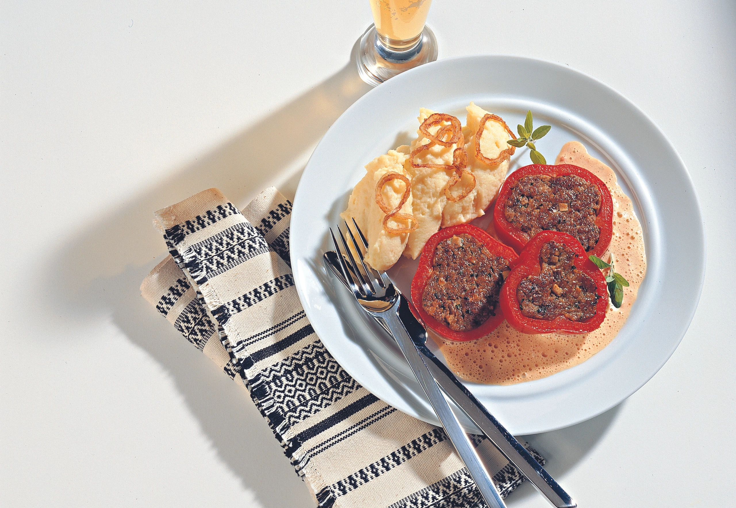 Faschiertes mit der Zwiebelmischung, Dotter, Bröseln, Salz, Pfeffer und Majoran verkneten. Paprika mit dem Faschierten füllen und in ca. 2 cm breite Scheiben schneiden.
