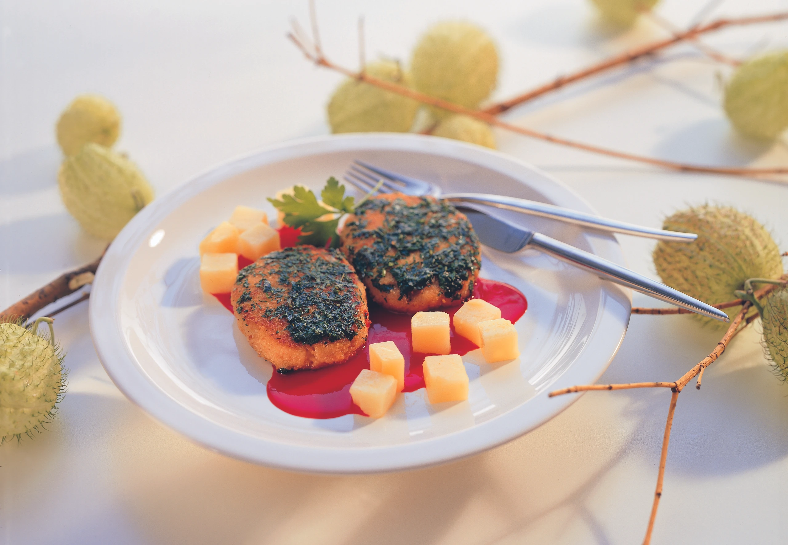 - Pfanne auswischen, die Butter darin bis zum Aufschäumen erhitzen. Die Hälfte der Kräuter einrühren, dann die Laibchen hinein legen und mit den übrigen Kräutern bestreuen. Laibchen bei mittlerer Hitze beidseitig kurz knusprig braten, dabei öfter mit Bratfett übergießen. Laibchen aus der Pfanne heben, gut abtropfen lassen und mit der Sauce und den Buttererdäpfeln anrichten.