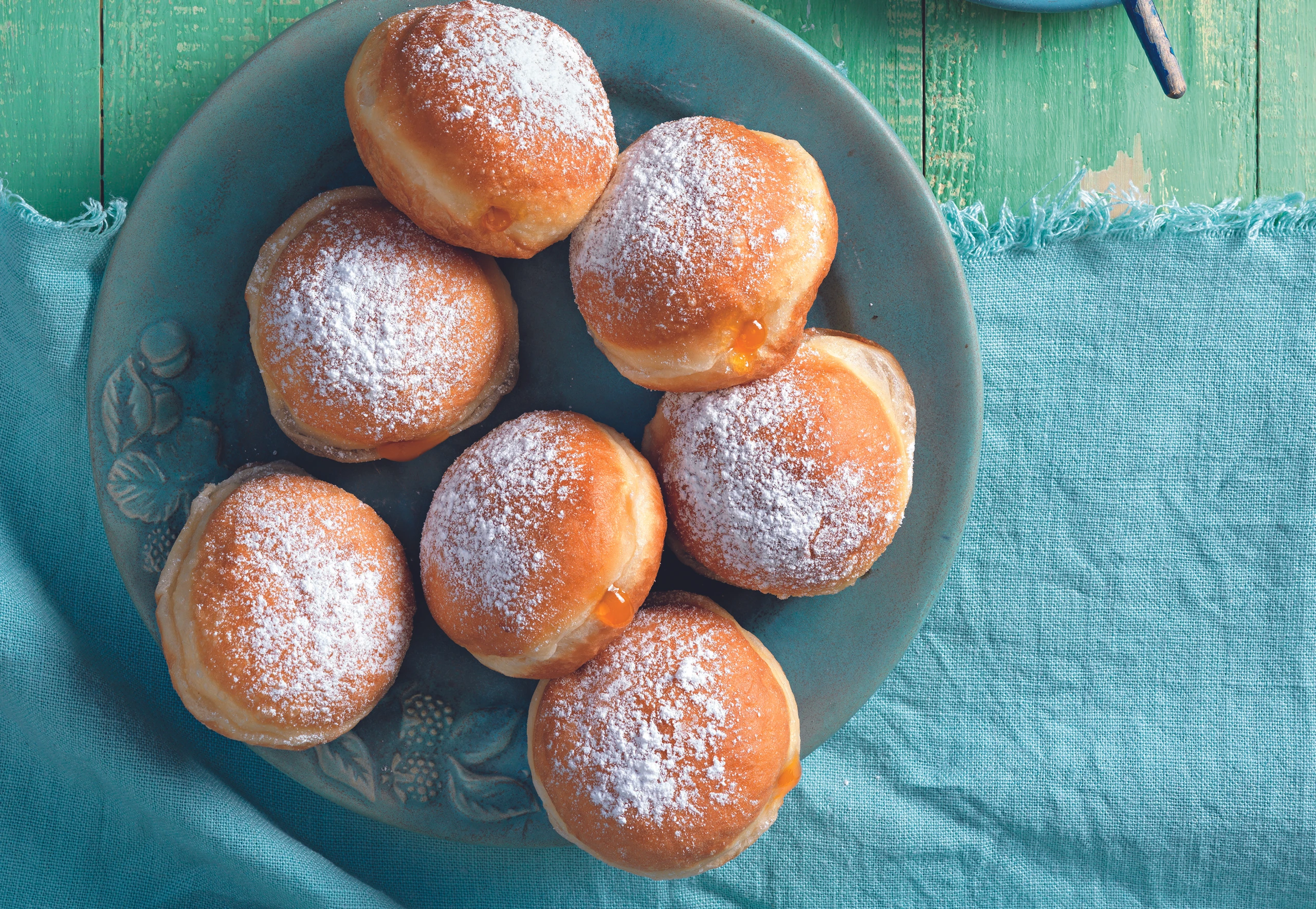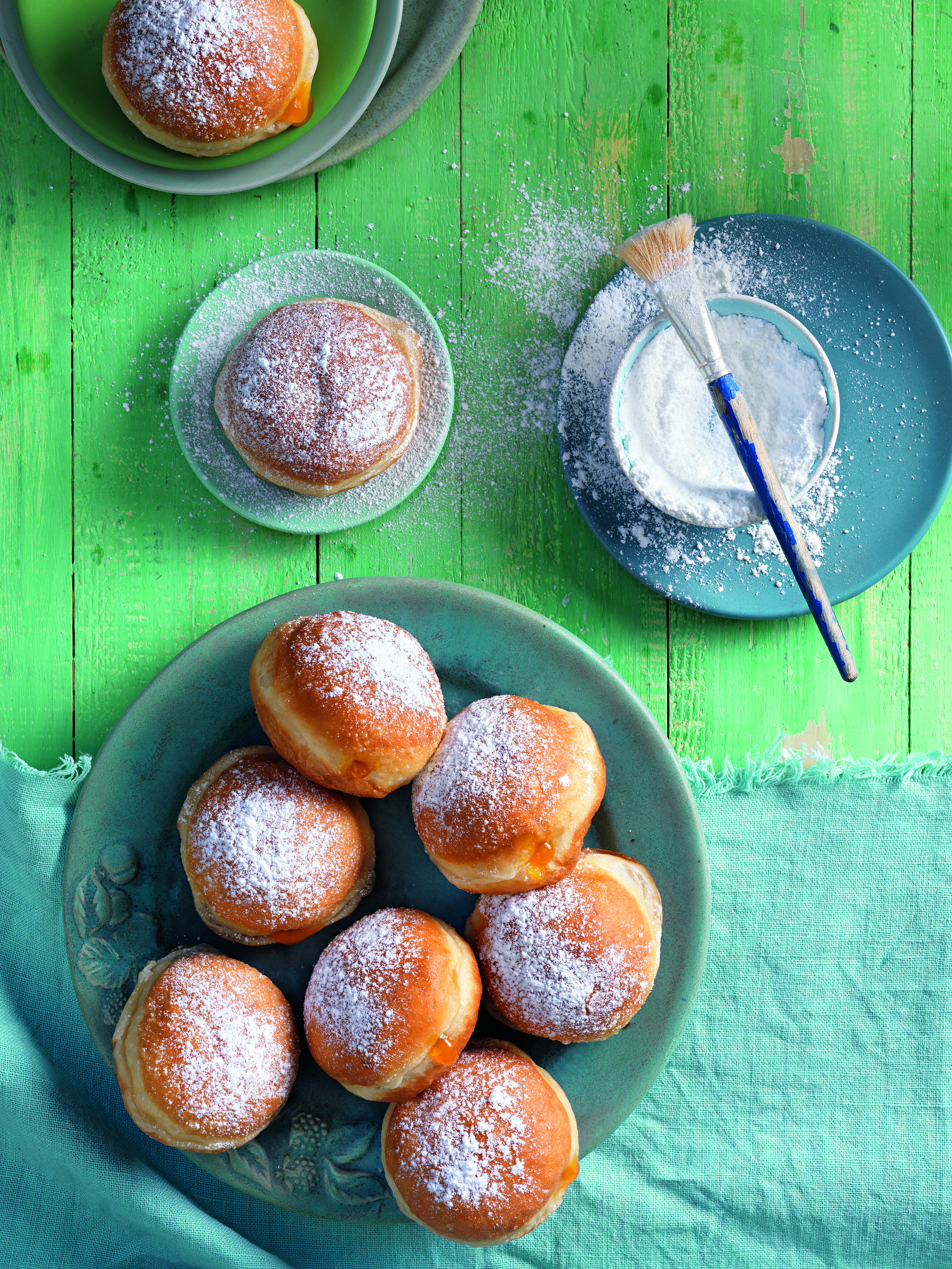 Ein Tuch auf ein umgedrehtes Backblech legen, mit Mehl bestreuen. Teigstücke darauflegen, mit einem Tuch zudecken. Ein zweites Blech darauf legen. Krapfen etwas flach drücken; sie müssen gleich hoch sein. Blech abheben, Krapfen mit einem Tuch abdecken und bei Zimmertemperatur ca. 30 Minuten aufgehen lassen.