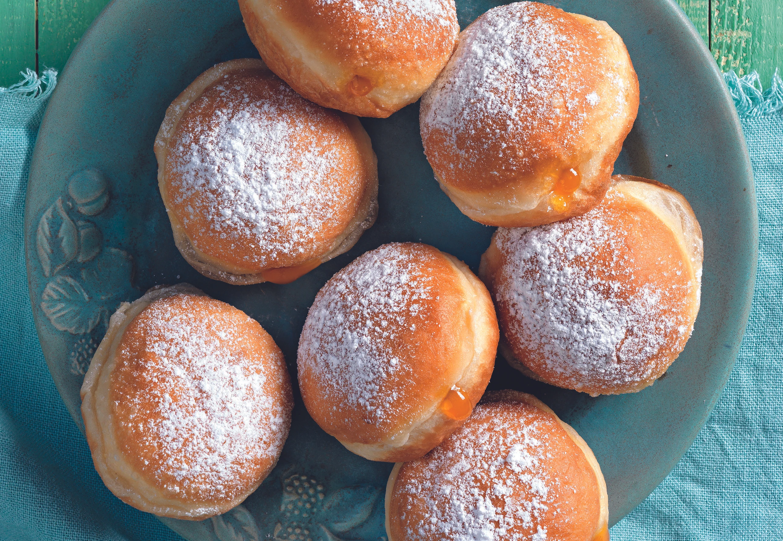 Ca. 4 Finger hoch Öl auf 170°C erhitzen. Krapfen mit der Oberseite nach unten ins Öl legen, zugedeckt ca. 1 Minute anbacken, wenden und ca. 1 Minute offen fertig backen. Herausheben und auf Küchenpapier abtropfen lassen.