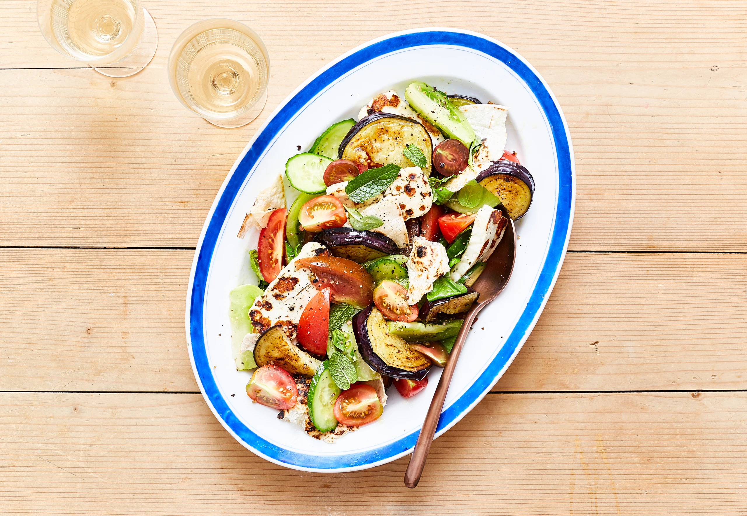 Halloumi in Scheiben schneiden und in der Pfanne ohne Zugabe von Öl beidseitig goldbraun braten. Tortillafladen in Stücke reißen und mit dem Halloumi unter den Salat mischen.
