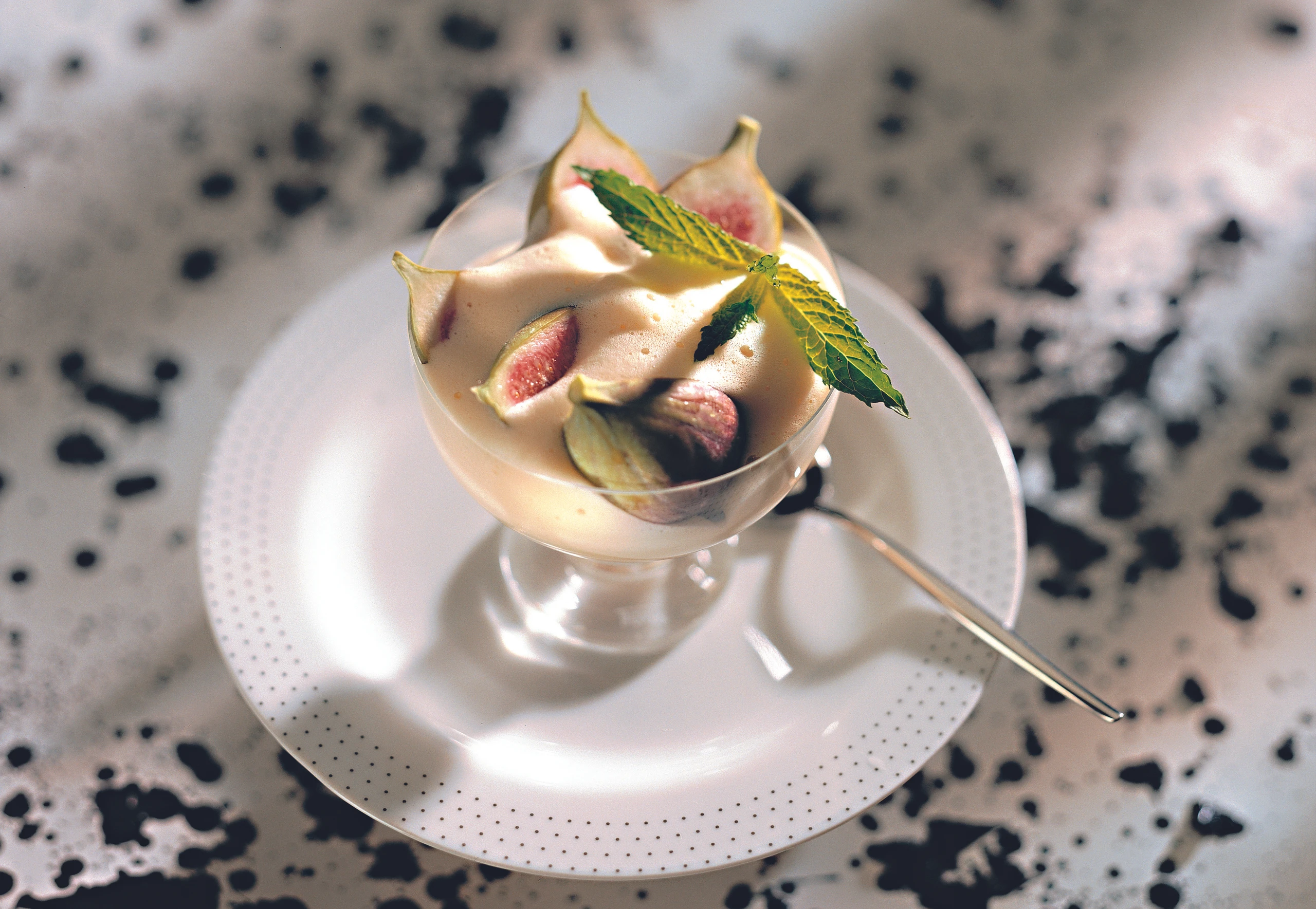 Marsalaschaum vom Dampf nehmen und über die Feigenstücke gießen, Dessert mit Minze garnieren und rasch servieren.
