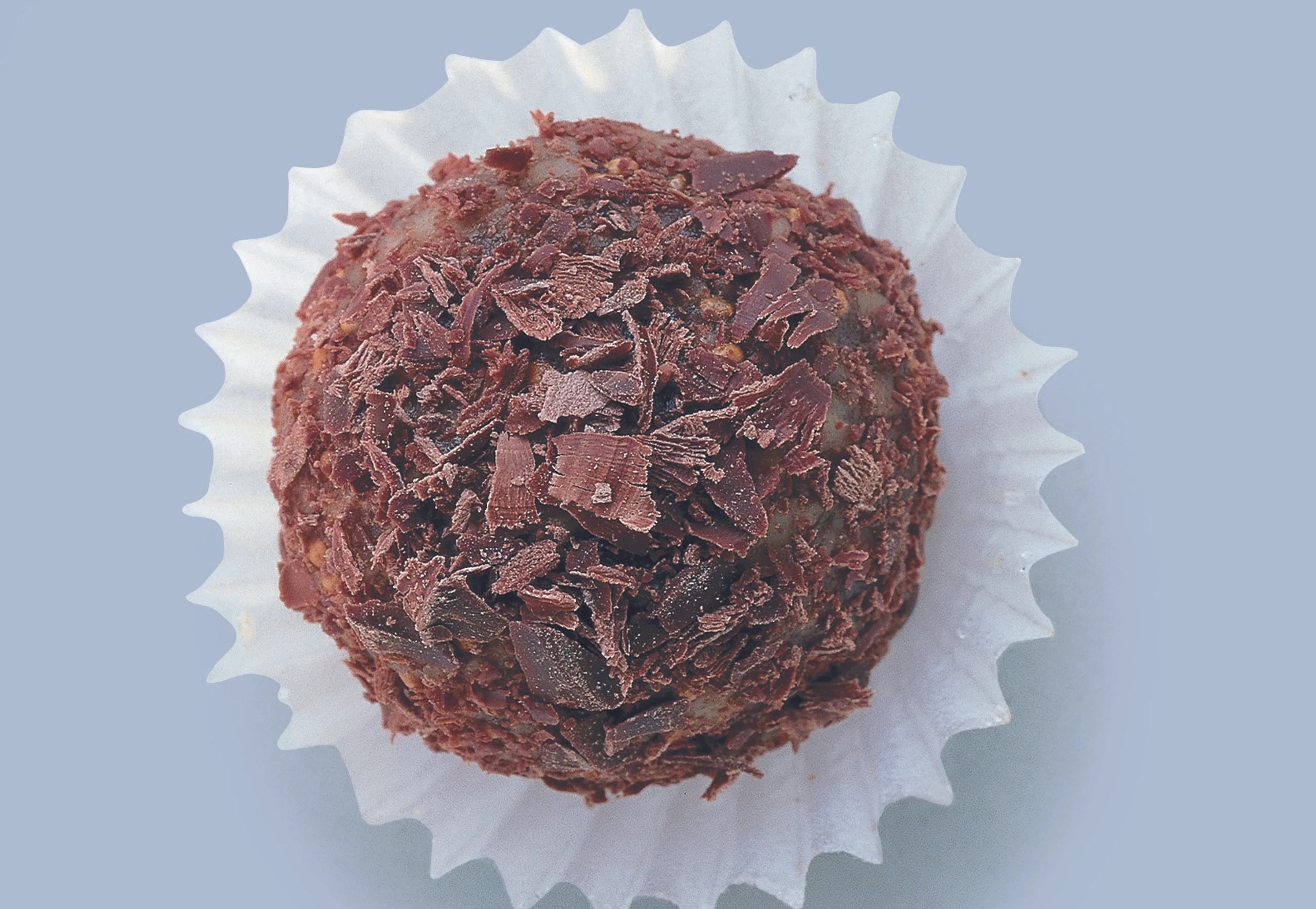 Aus der Fruchtmasse kleine Kugeln formen und in geriebener Schokolade wälzen. Fruchtkugeln in kleine Papiermanschetten setzen.