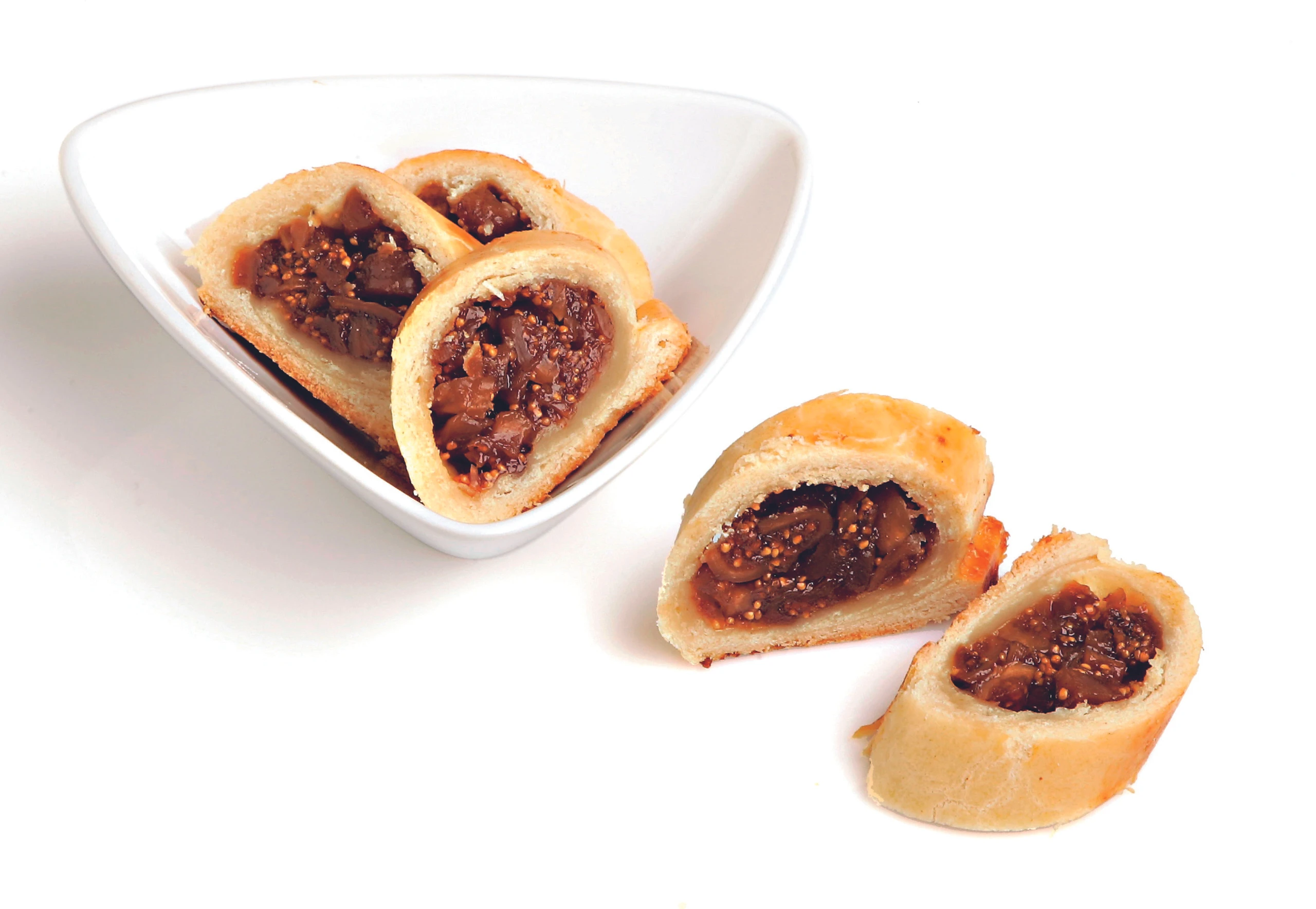 Teigränder mit Eiklar bestreichen. Fülle der Länge nach am Rand auftragen (ca. 3 EL auf jedes Rechteck). Teig einrollen, Rollen auf ein mit Backpapier belegtes Blech legen.