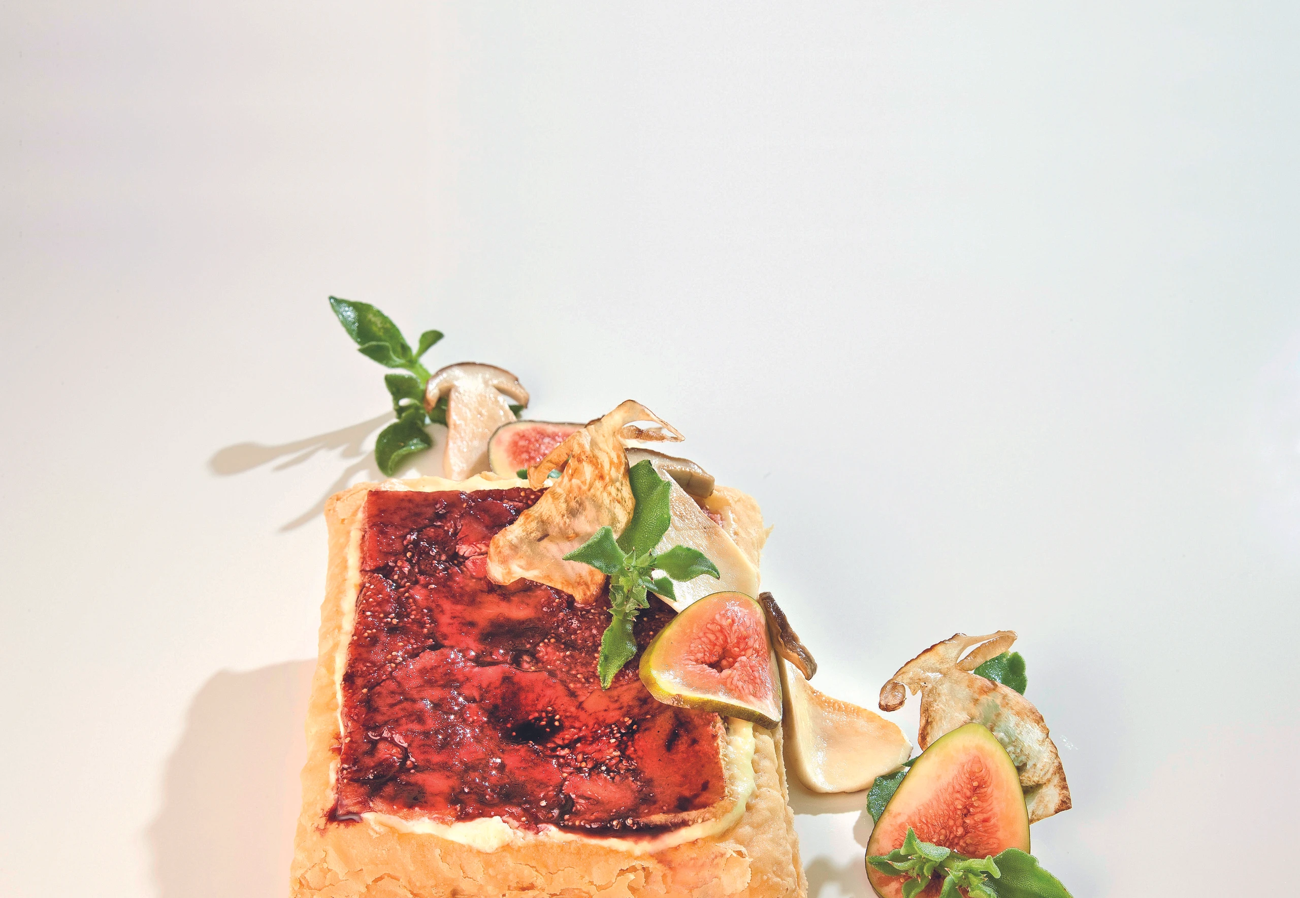 - Blätterteig mit Käsecreme bestreichen, die angefrorene Feigenmatte aus dem Sackerl nehmen, darauflegen und im Rohr 10 Minuten backen. Herausnehmen und mit Feigenlack bestreichen.